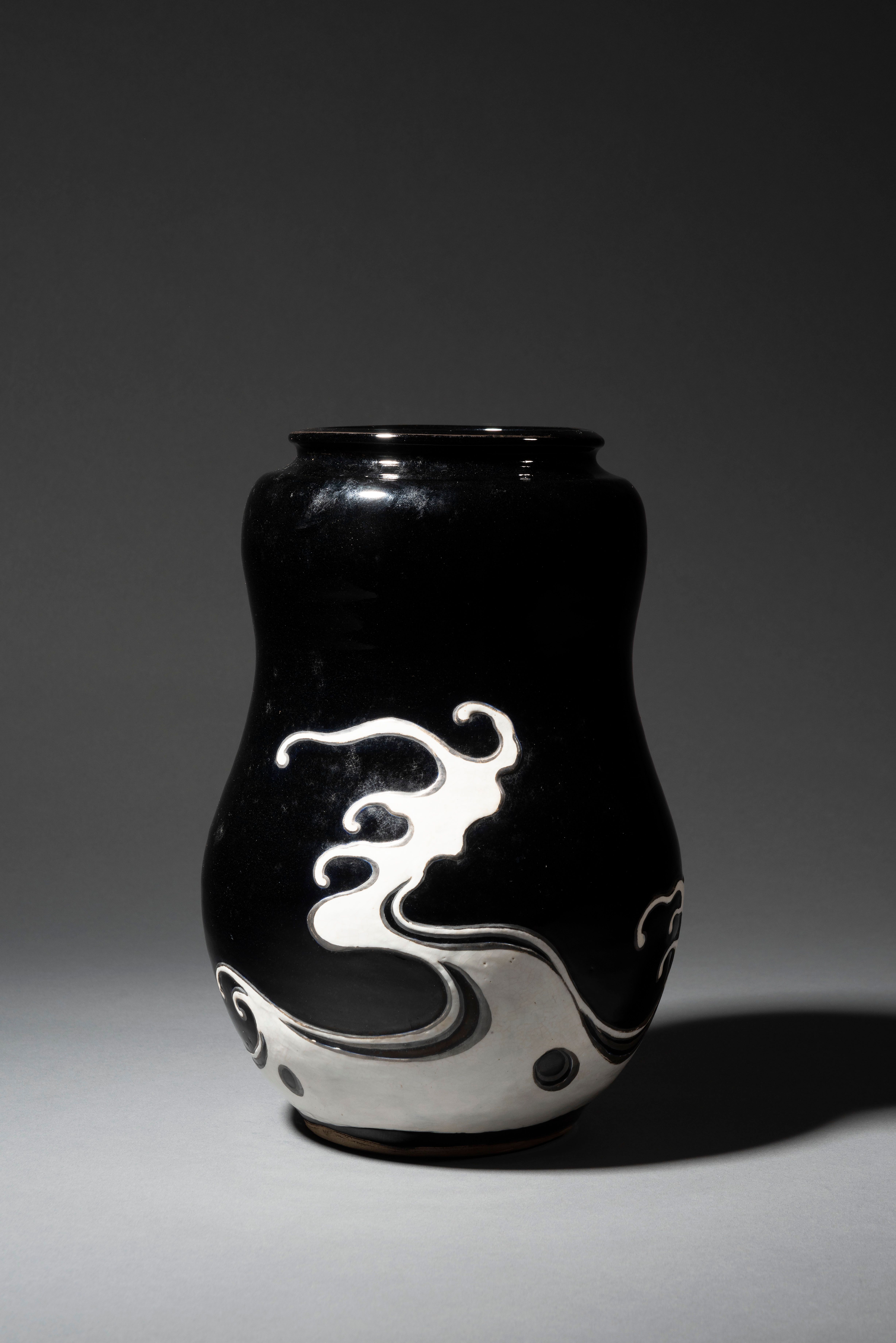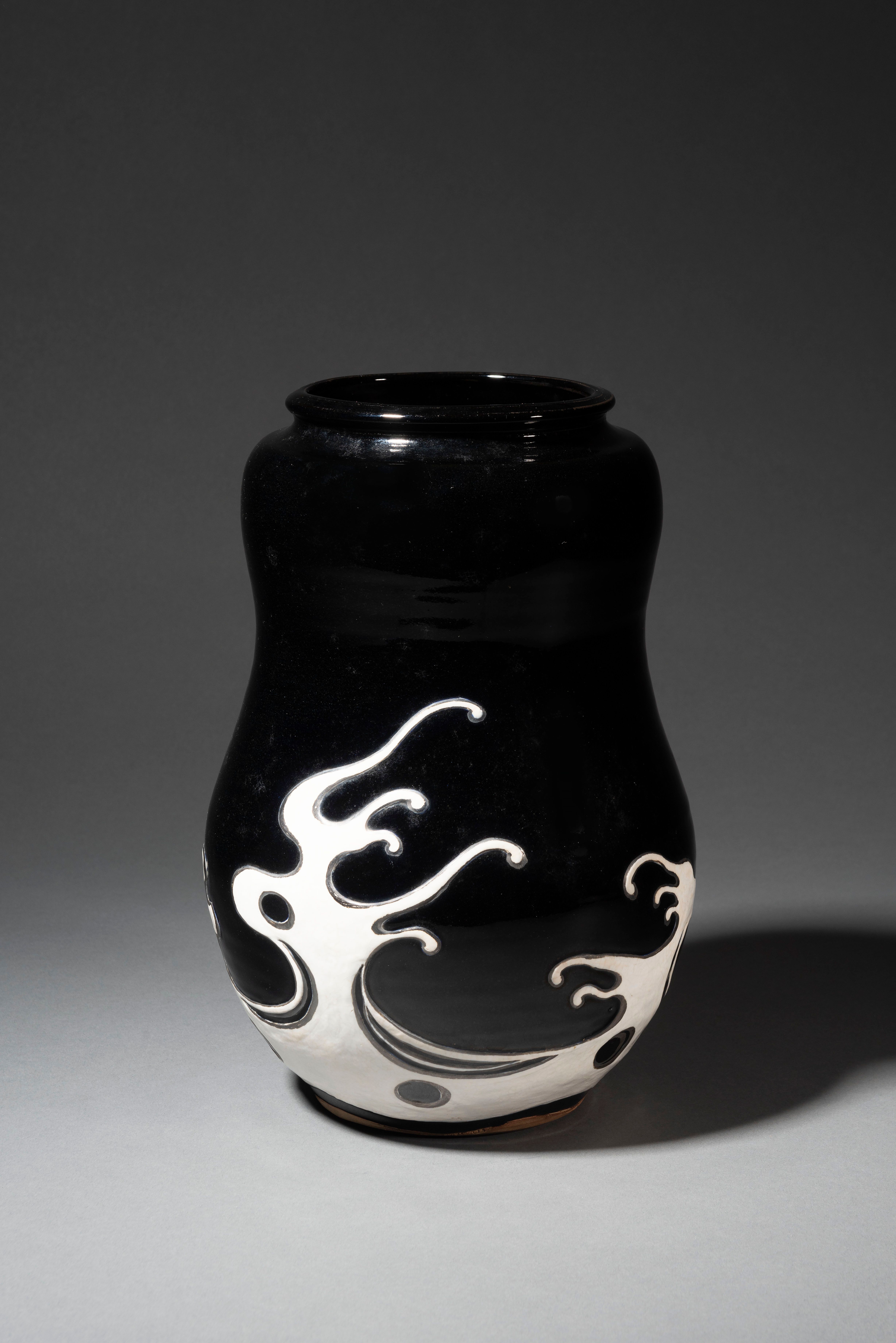 A ceramic vase of bulbous double-gourd form, decorated in enamel with a stylised design of cresting white waves against a black ground by Makuzu Kōzan II (1859-1940).