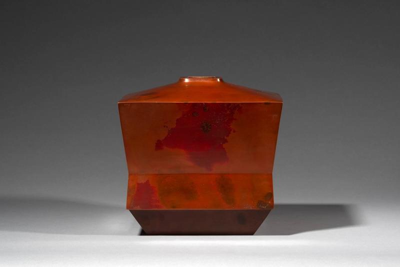 A square bronze vessel with mottled patina by Hasuda Shugoro (1915-2010).