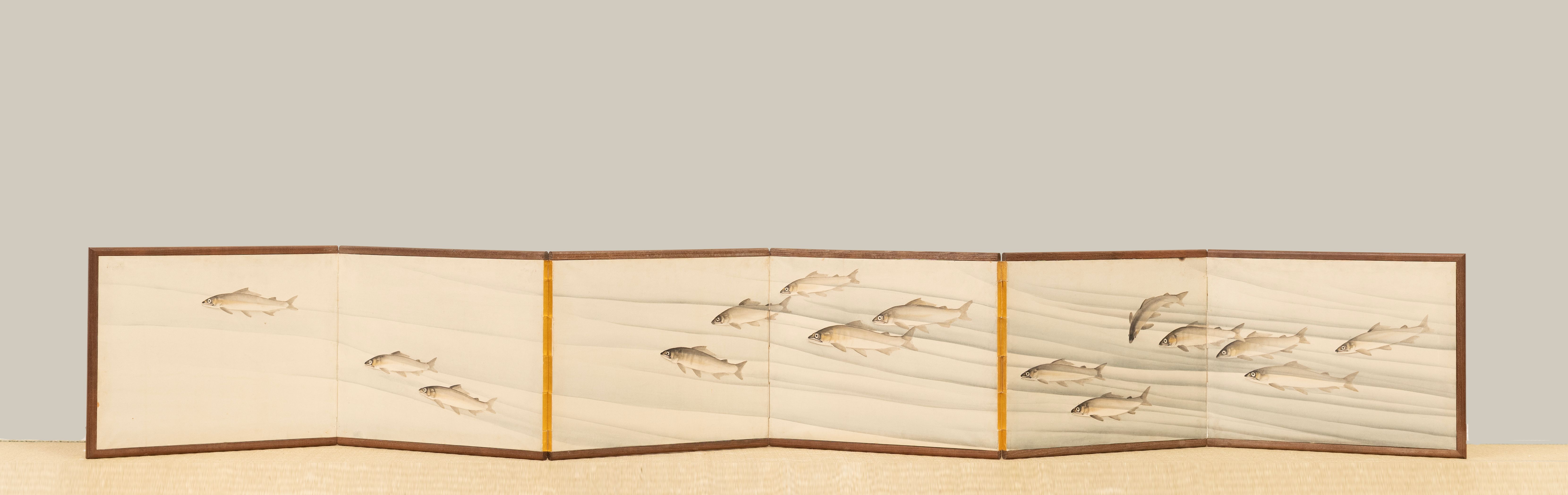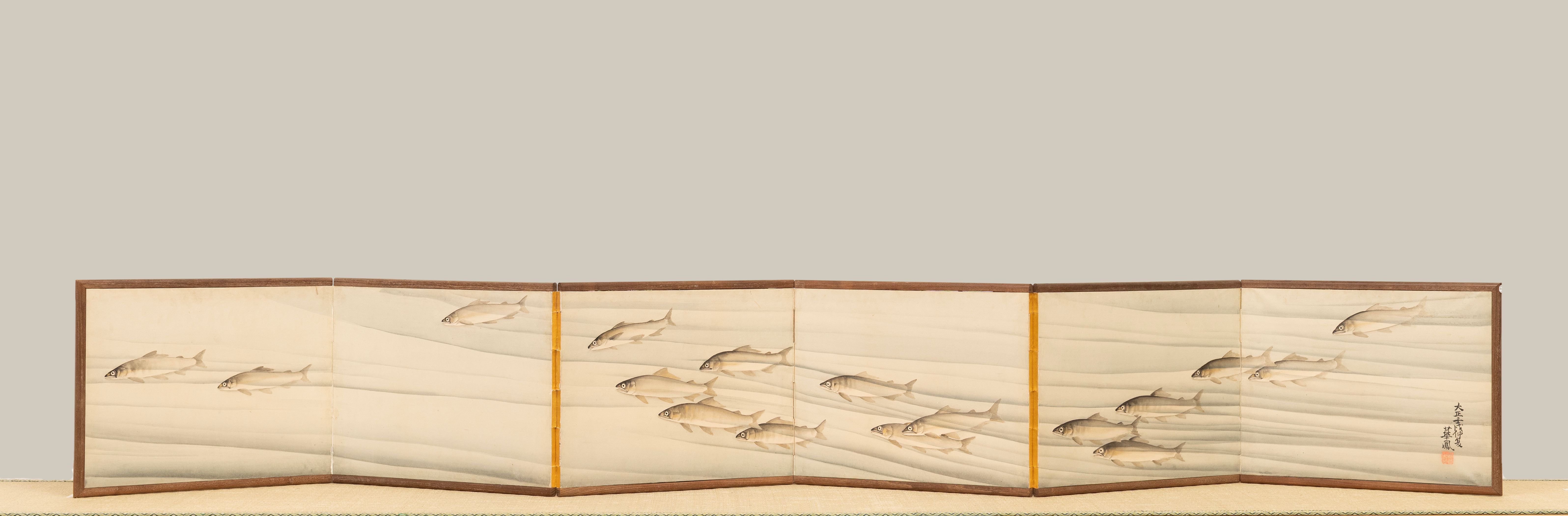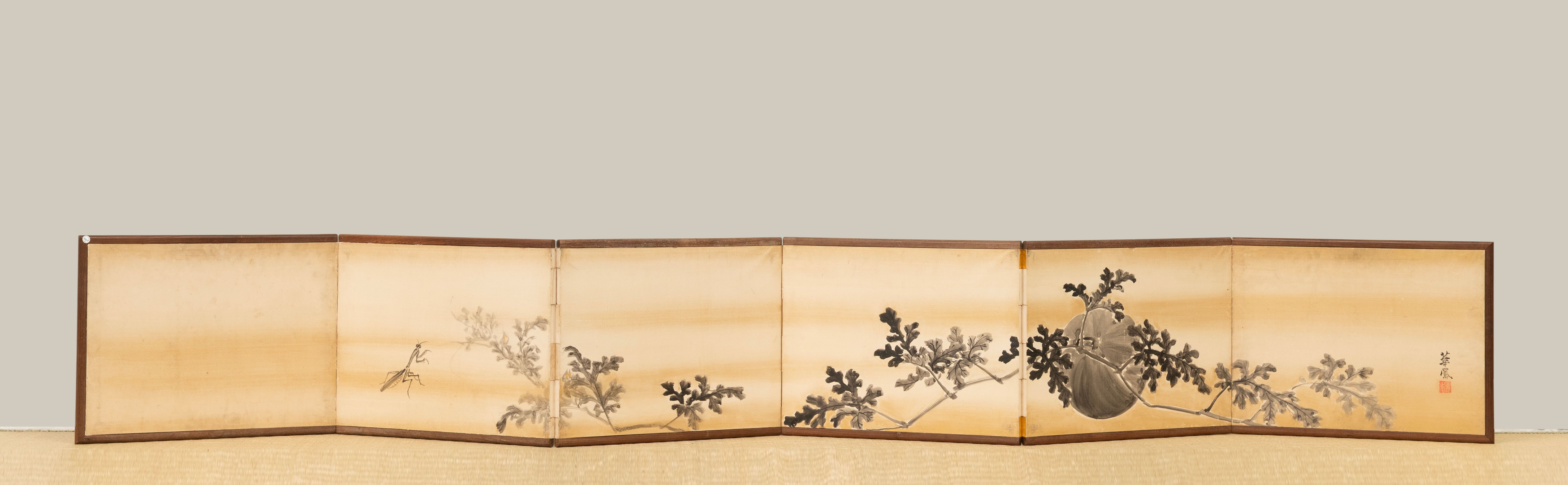 A pair of six-fold paper makura-byobu (pillow screens) painted in ink and colour with a school of ayu sweetfish; the reverse side of the screen depicting vines of watermelons and a praying mantis, by Nakajima Kaho (1866-?).