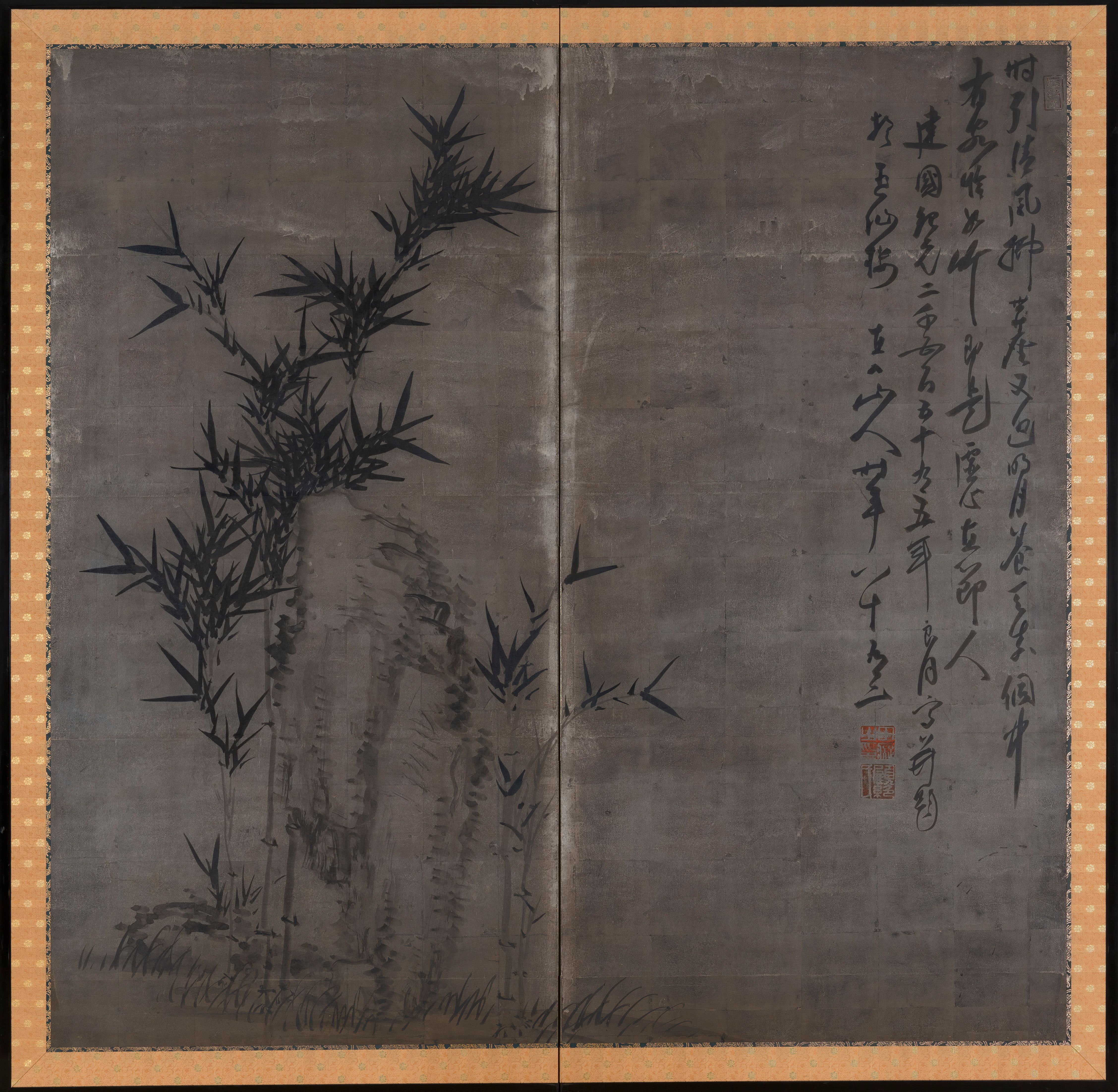 Tanomura Chokunyu - screen painted in ink on a silver ground with a rock, bamboo and calligraphy