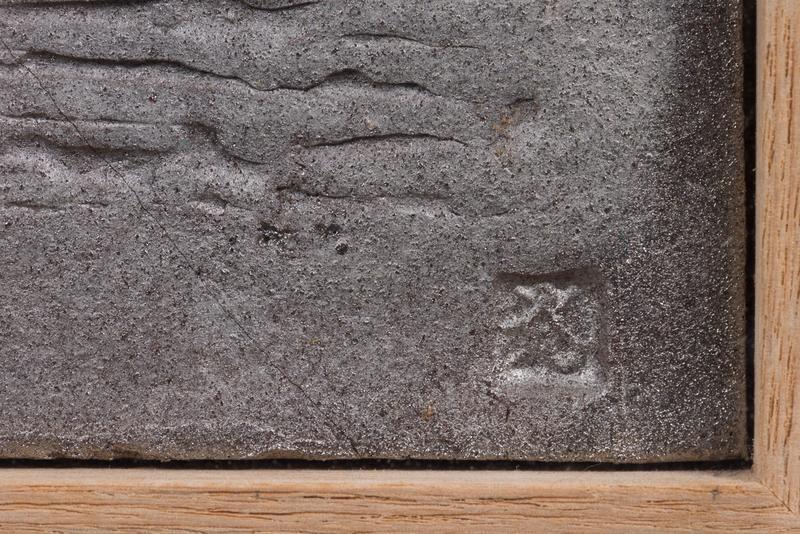 A silver glazed ceramic panel, mounted in a Perspex and wooden box frame.