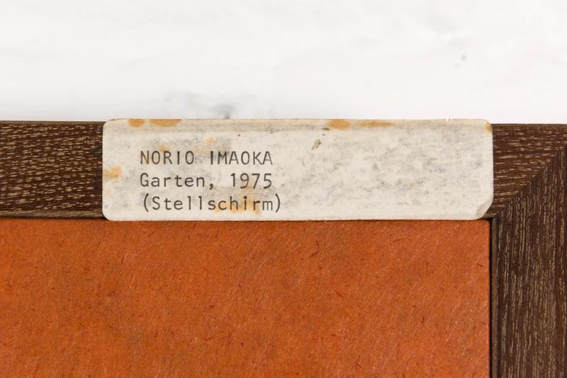 An exhibition label inscribed in German: Norio Imaoka, Garten (Garden), 1975 Stellschirm (folding screen) , Japan, 1975