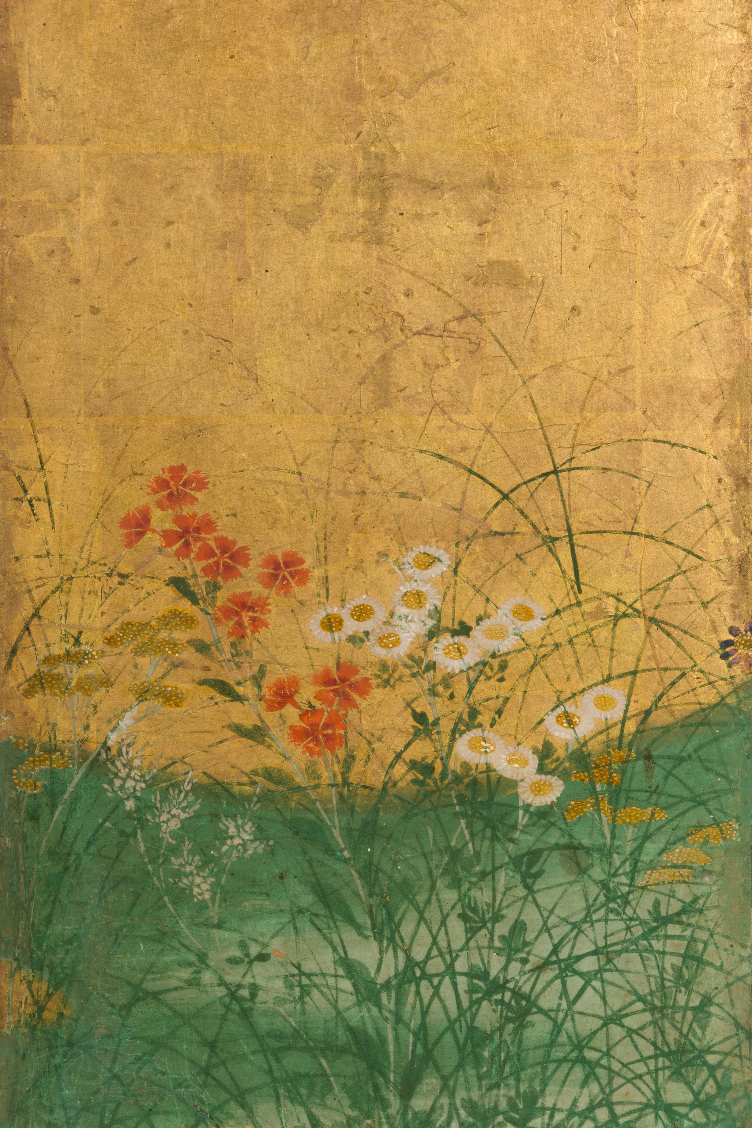 A six-fold paper screen painted in ink and colour on a gold ground with autumn flowers and grasses.