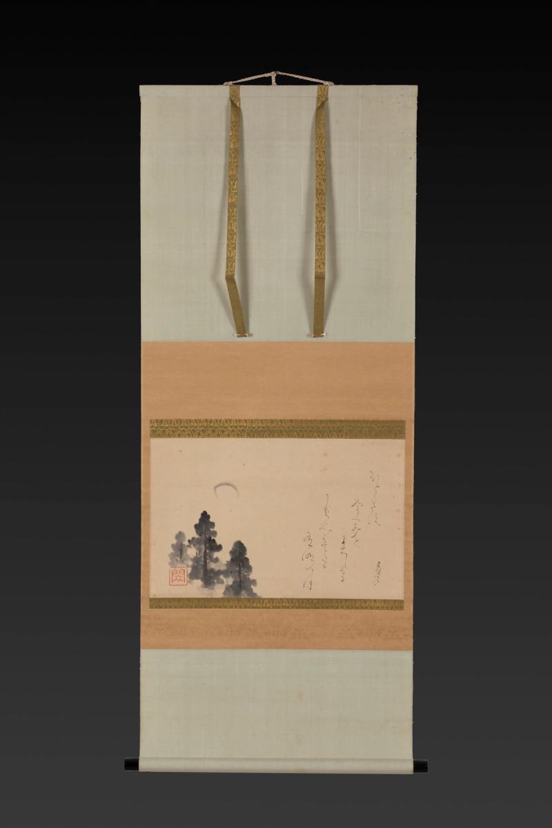 A kakemono (hanging scroll) executed in ink on paper with a painting of trees beneath the moon which is paired with a poem referring to a cuckoo's song and the setting moon.