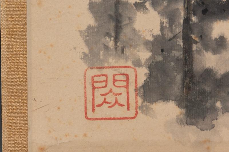 This hanging scroll is a collaboration between Rengetsu and her close friend, Wada Gozan. Gozan was a monk and painter of the late Edo period. He was originally from Osaka, but at the age of 42 he lost his wife and became a priest in Kyoto, taking the Buddhist name Gesshin (Moon mind). He later became the chief priest of Jinkōin Temple where Rengestu lived in her later life. Gozan took on the successive monk names of Gesshin, Ashuku and Kūsō. The seal on this painting reads ‘shuku’, which is taken from his monk name ‘Ashuku’.