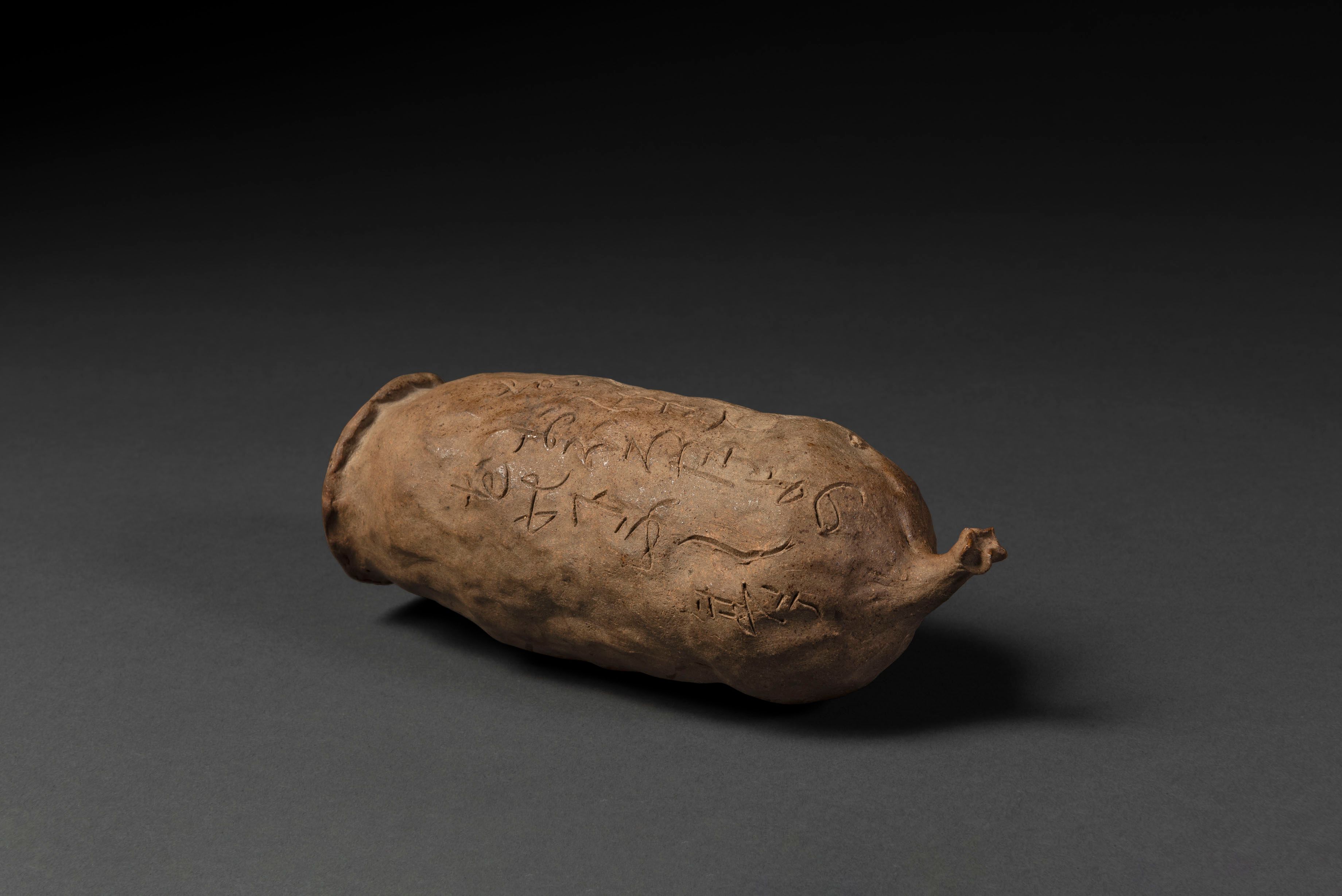 A pottery kake hanaire (hanging flower vessel) in the form of a hechima (sponge gourd) incised with a poem by Otagaki Rengetsu.