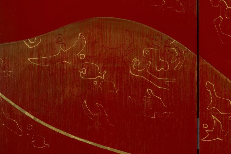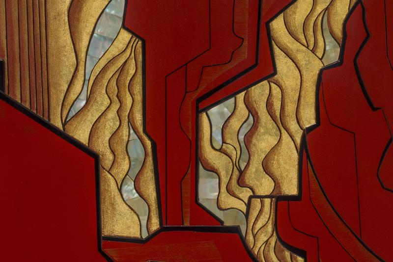 A two-fold lacquer screen with an abstract mountainous landscape in red, black and gold with details in mother-of-pearl.