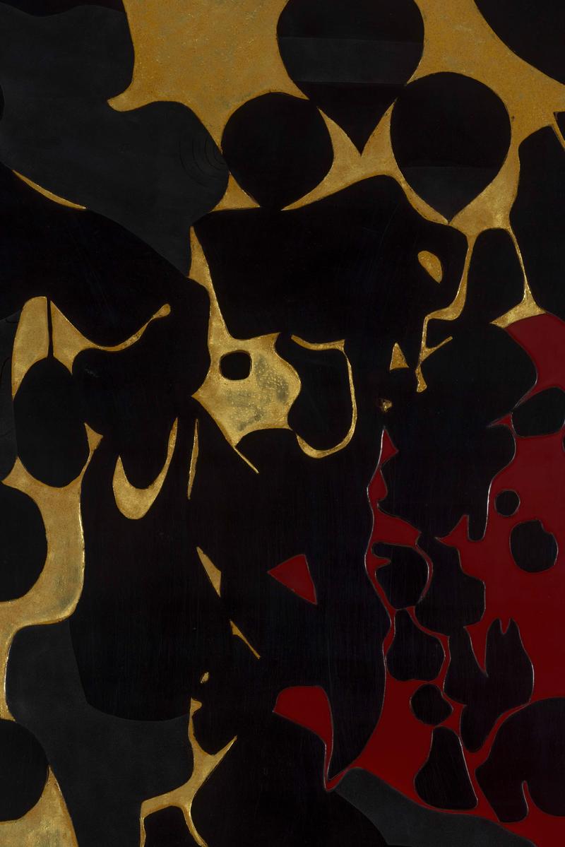 A two-fold lacquer screen with an abstract design in black and gold on a red ground.