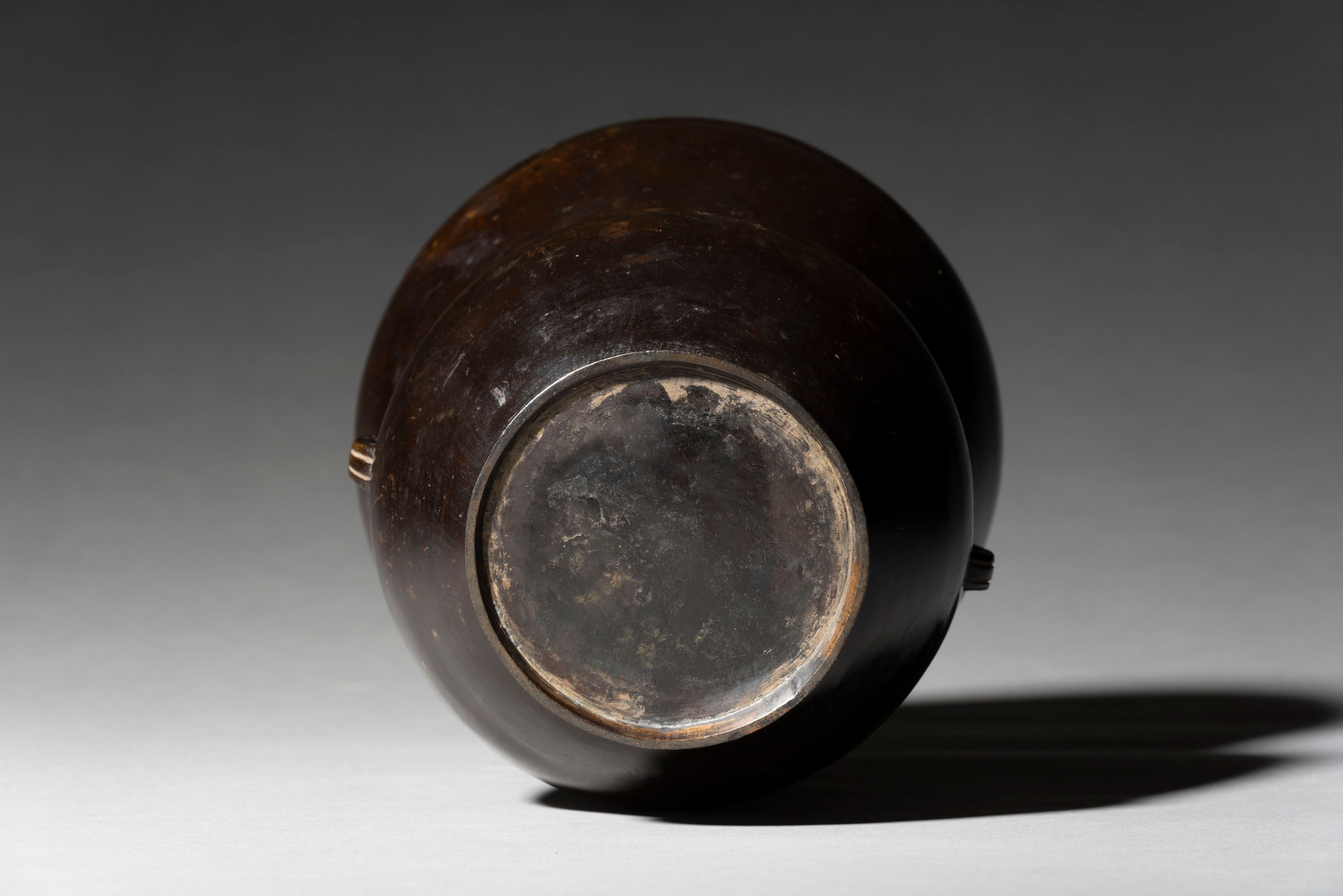 The form of this bronze vessel is after a type of Chinese ceramic chaire (tea caddy), a bulbous body with a tall, outspread neck and broad rim, which is called ankoh (anglerfish) chaire for its wide mouth is likened to the large mouth of this deep-sea fish.