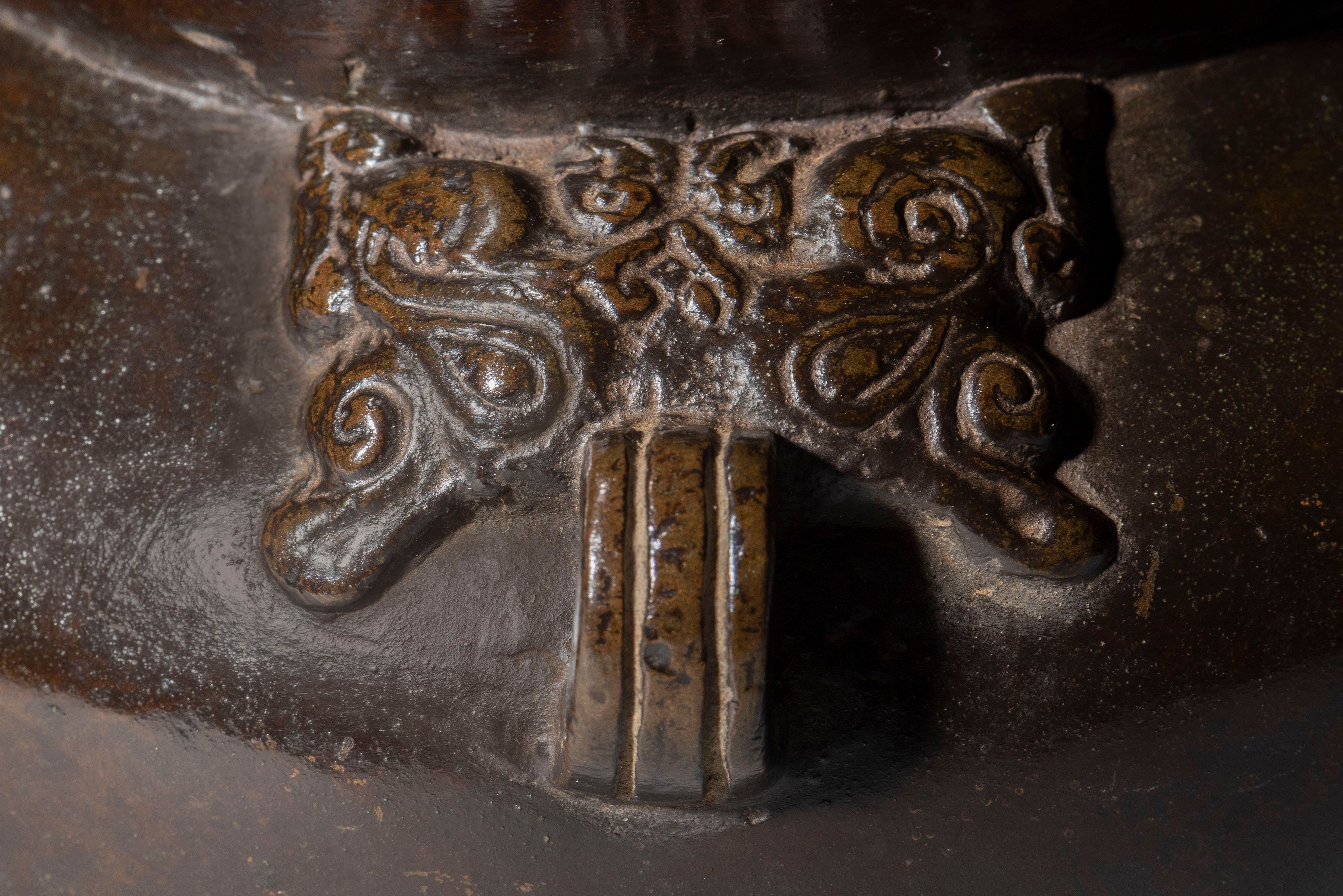 This vase also exemplifies the development of forms in bronze vases made in the Edo period (1603-1868). From the early Edo period, Japanese bronze vessels tend not to directly copy the Chinese originals but rather transform them, sometimes exaggerating certain features, probably to adjust them to the changing styles of flower arrangement from the Muromachi period (1568-1616) onwards. The wide-mouthed bronze vases with a trumpet-shaped top are found in a scroll of flower arrangements (dated 1678), which suggests that the vases with a wide mouth such as this were made from the 17th century or earlier.