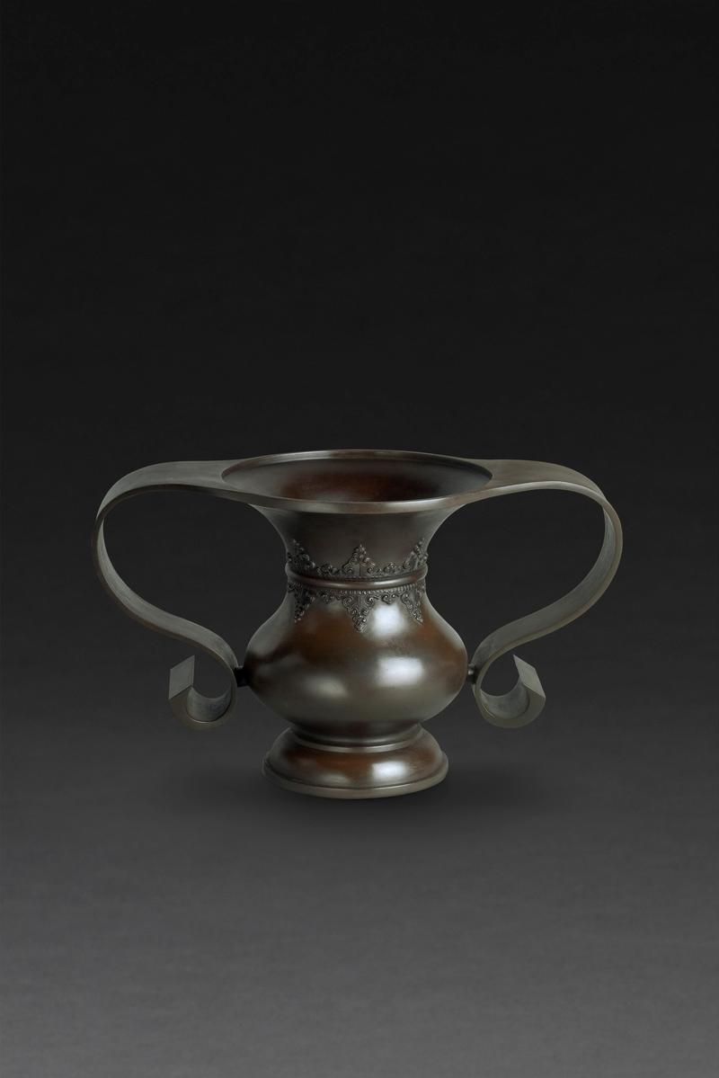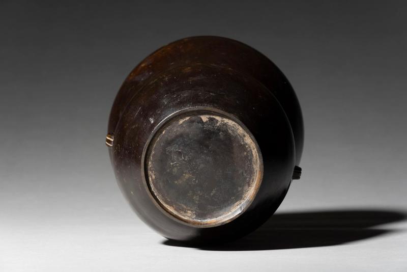 The form of this bronze vessel is after a type of Chinese ceramic chaire (tea caddy), a bulbous body with a tall, outspread neck and broad rim, which is called ankoh (anglerfish) chaire for its wide mouth is likened to the large mouth of this deep-sea fish.