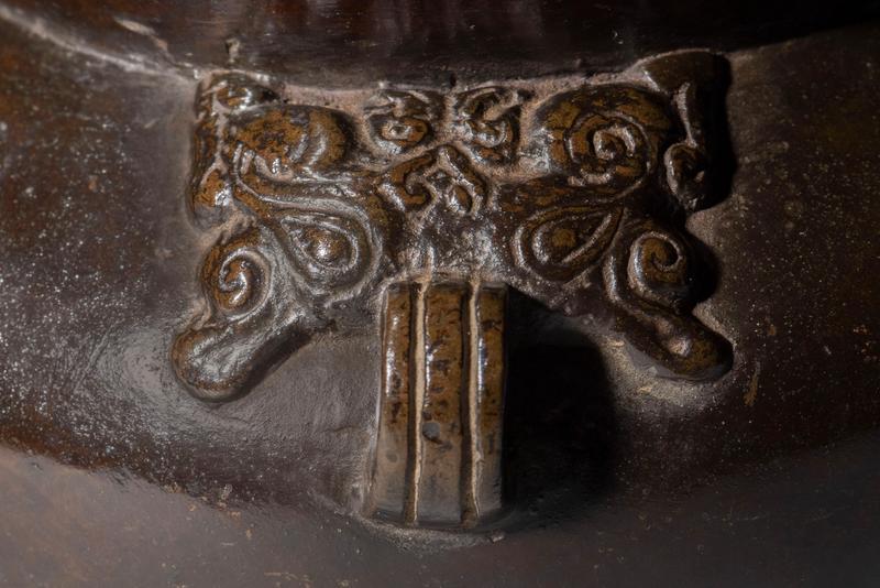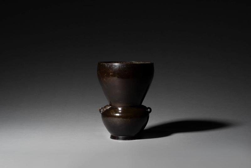 A bronze flower vessel of the so-called ankoh (anglerfish) form with two Taotie mask ‘handles’ on the shoulder in relief.