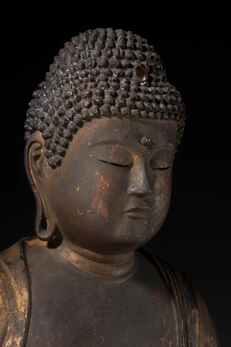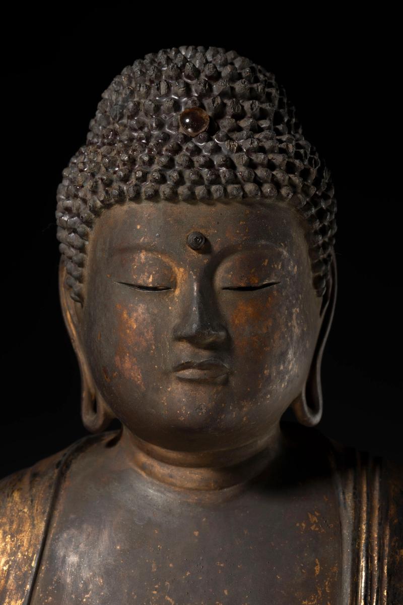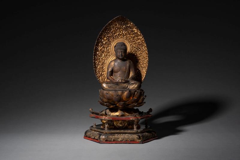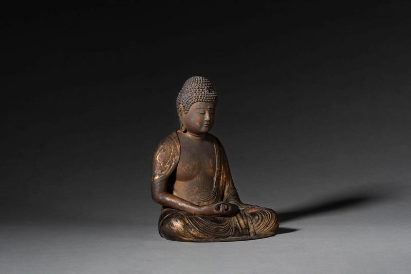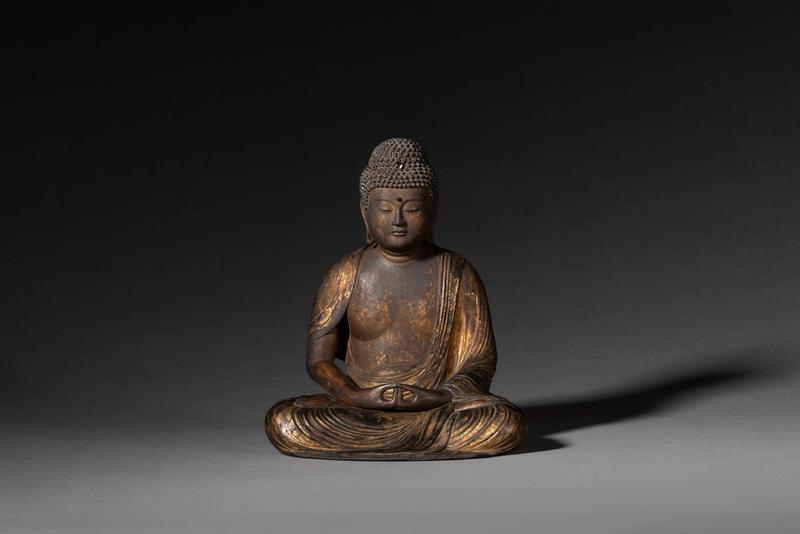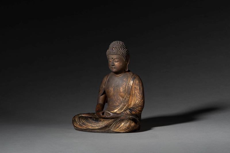 A lacquer and gilt wood figure of a seated Amida Nyorai (Amitābha) dressed in a flowing robe