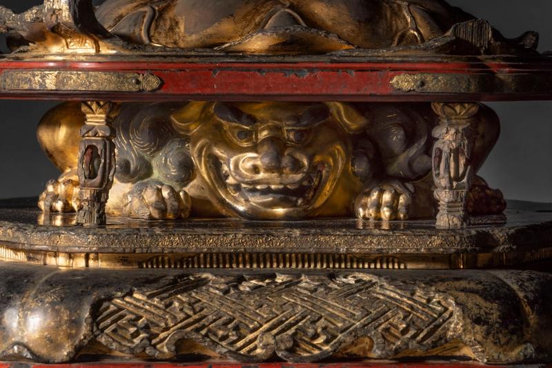 A lacquered wood zushi (travelling shrine), containing a figure of Jizō Bosatsu seated on a double-lotus base before a mandorla with three Nyo-i Hōju (wish granting jewels). Jizō holds a shakujō (Buddhist staff) in the right hand and a Nyo-i Hōju in the left. The robes and base are delicately decorated in kirikane (thin cut strips of gold). The zushi has gilt metal mounts and the interior is gilded, the doors painted with a design of lotus flowers