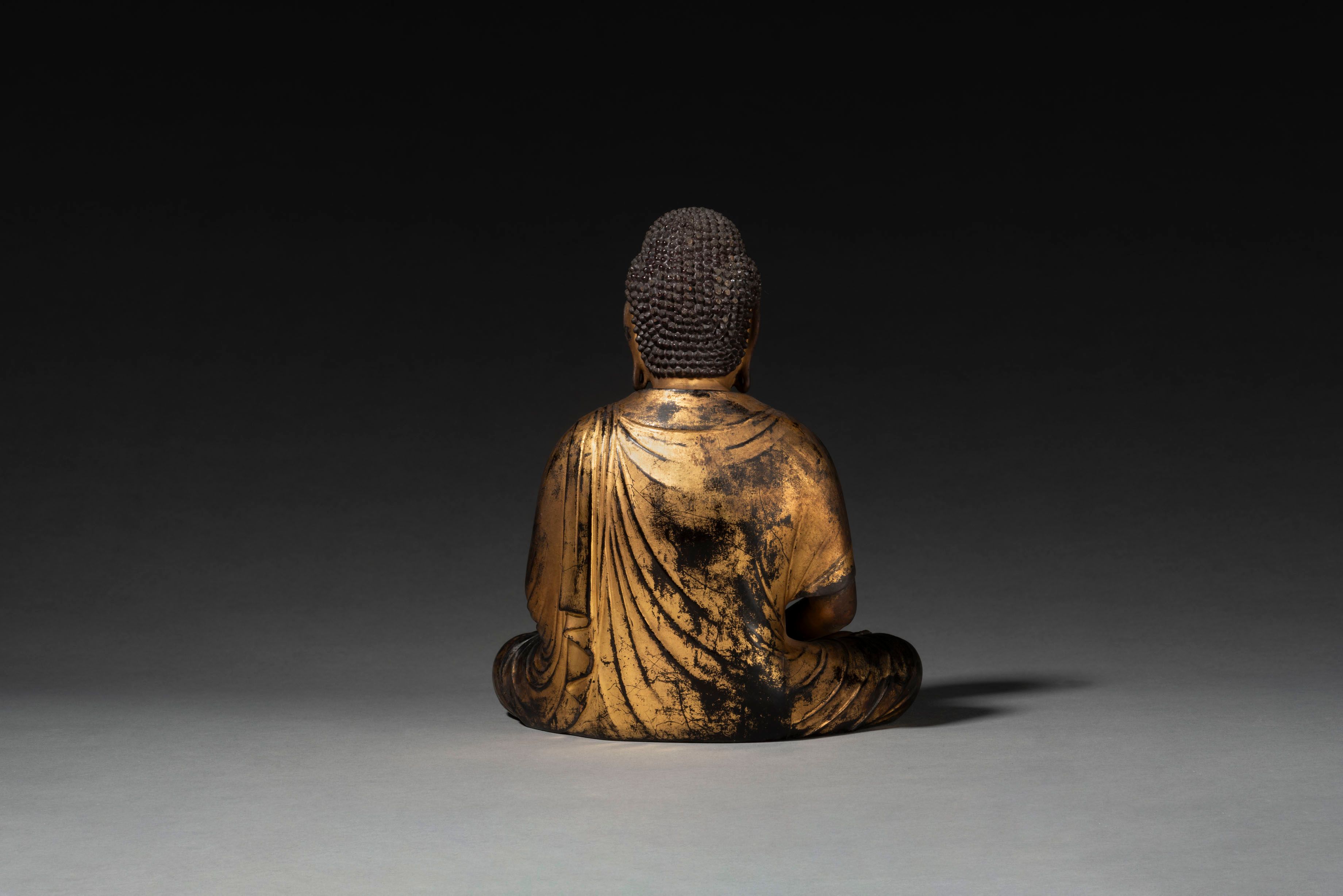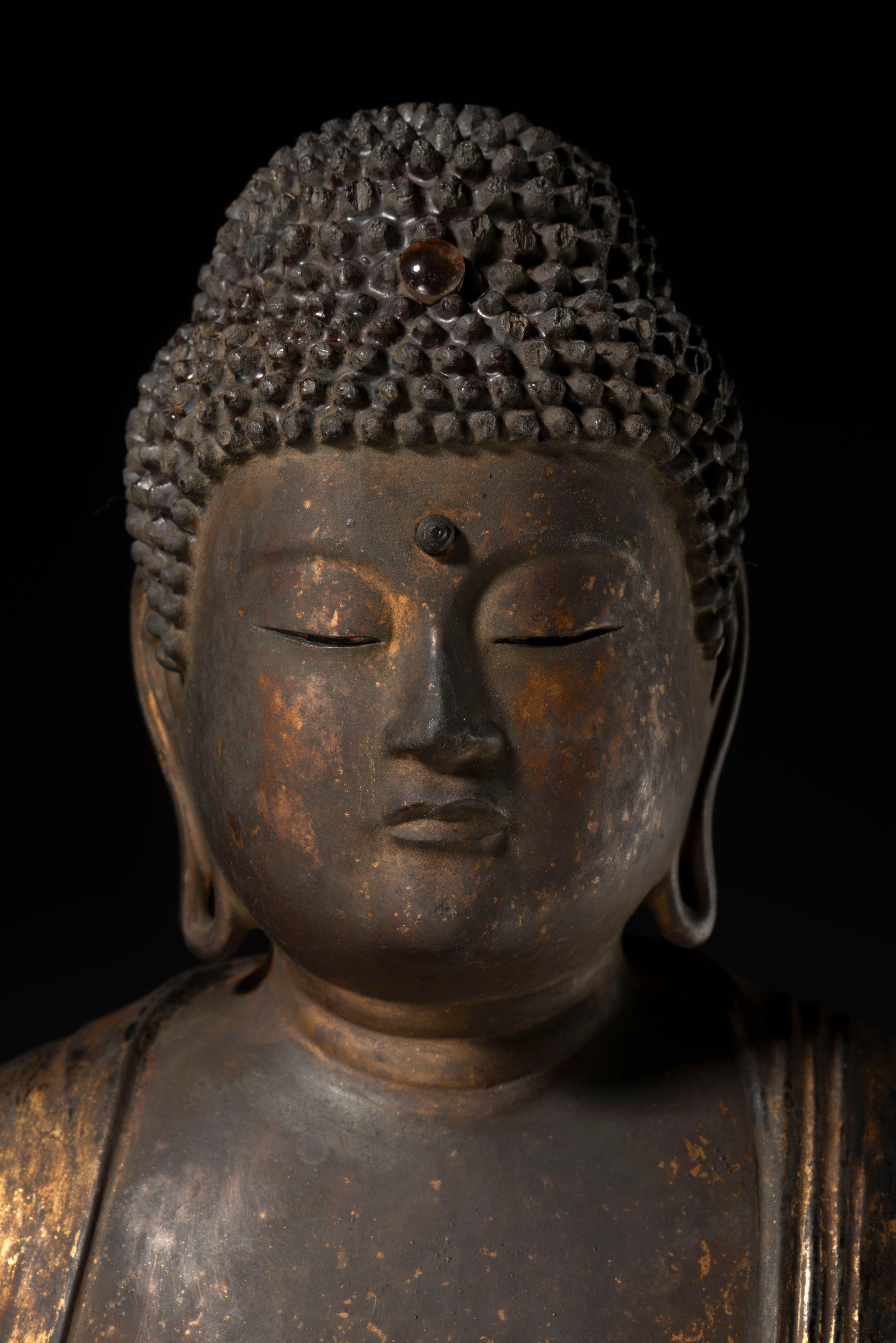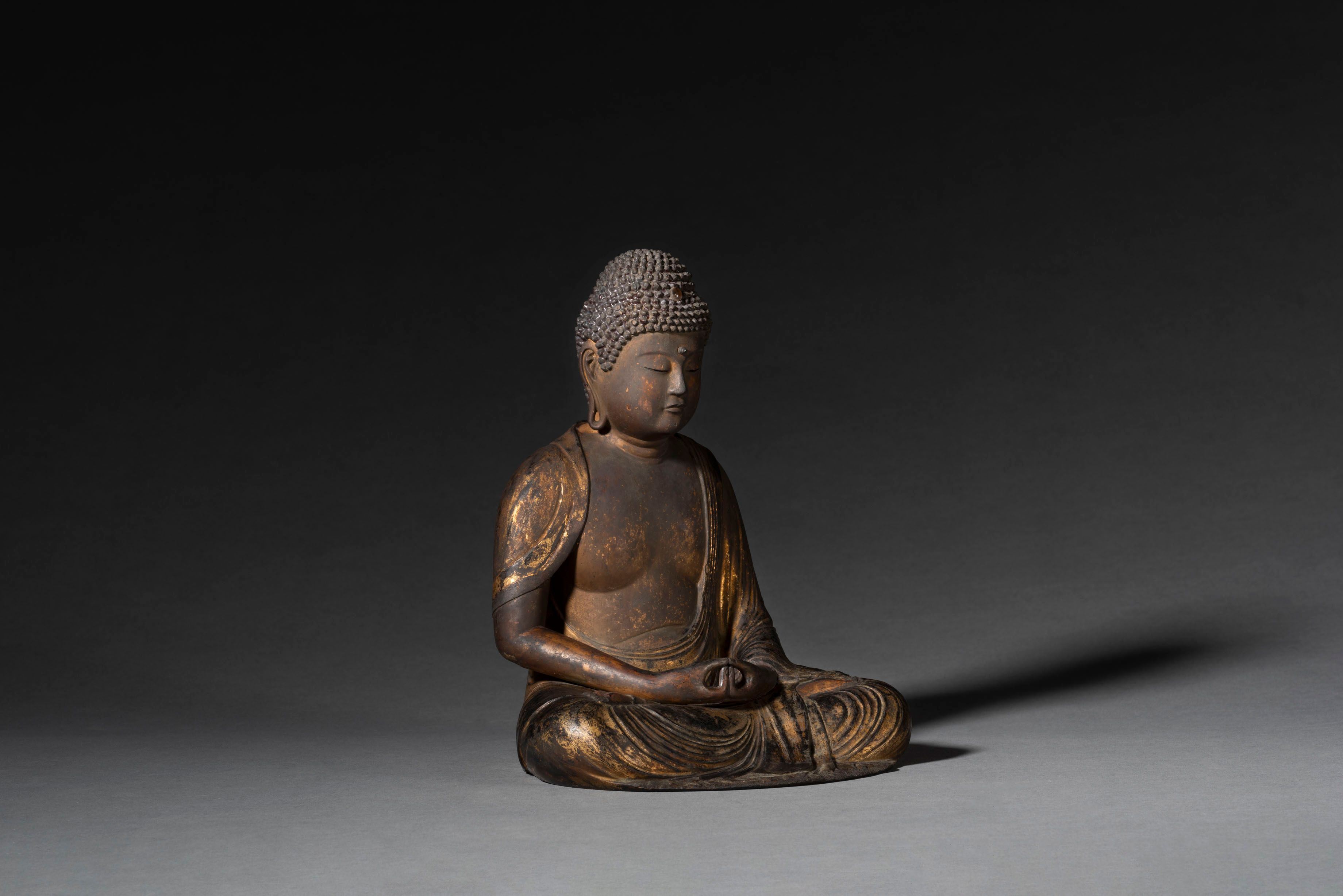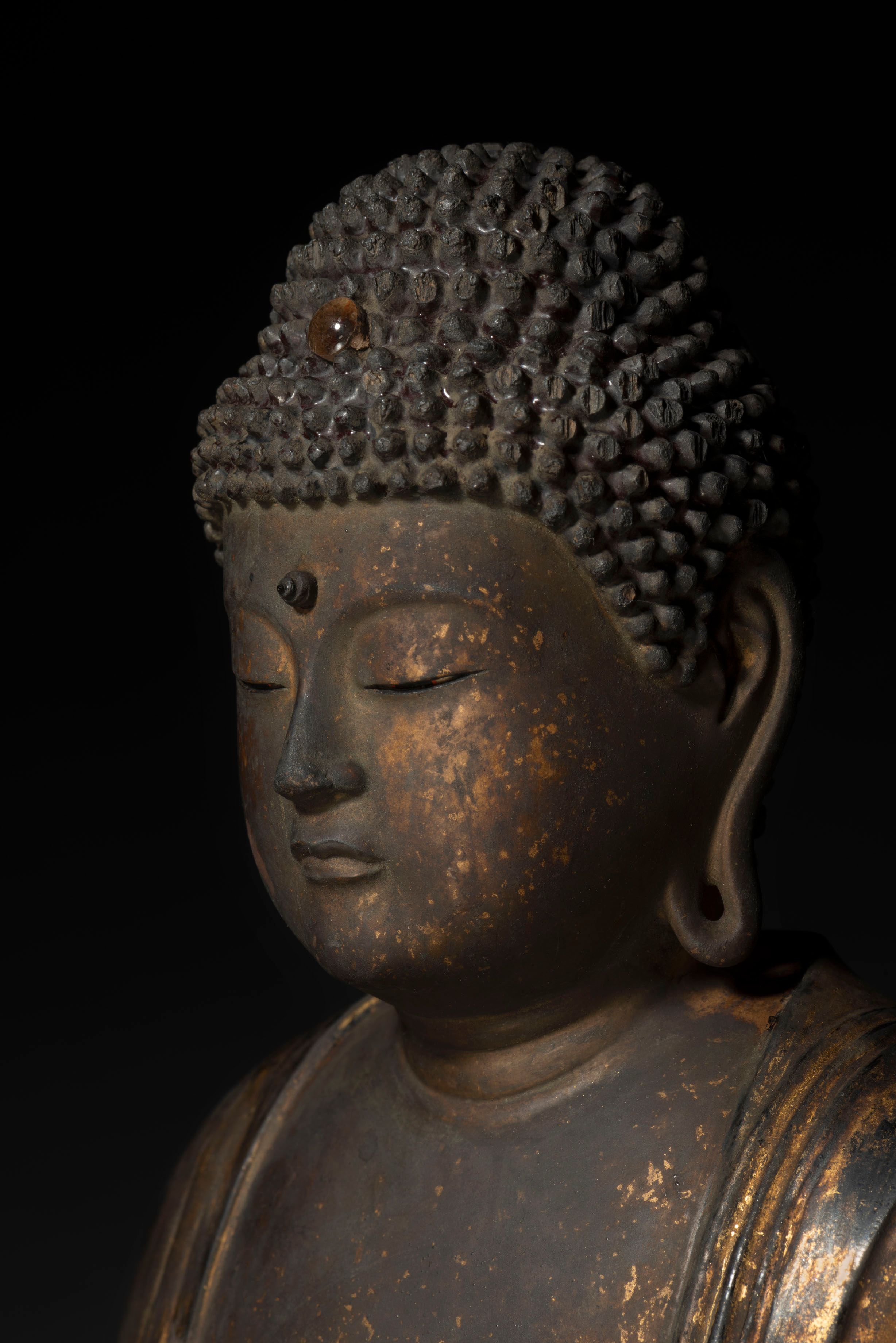 A lacquer and gilt wood figure of a seated Amida Nyorai (Amitābha) dressed in a flowing robe