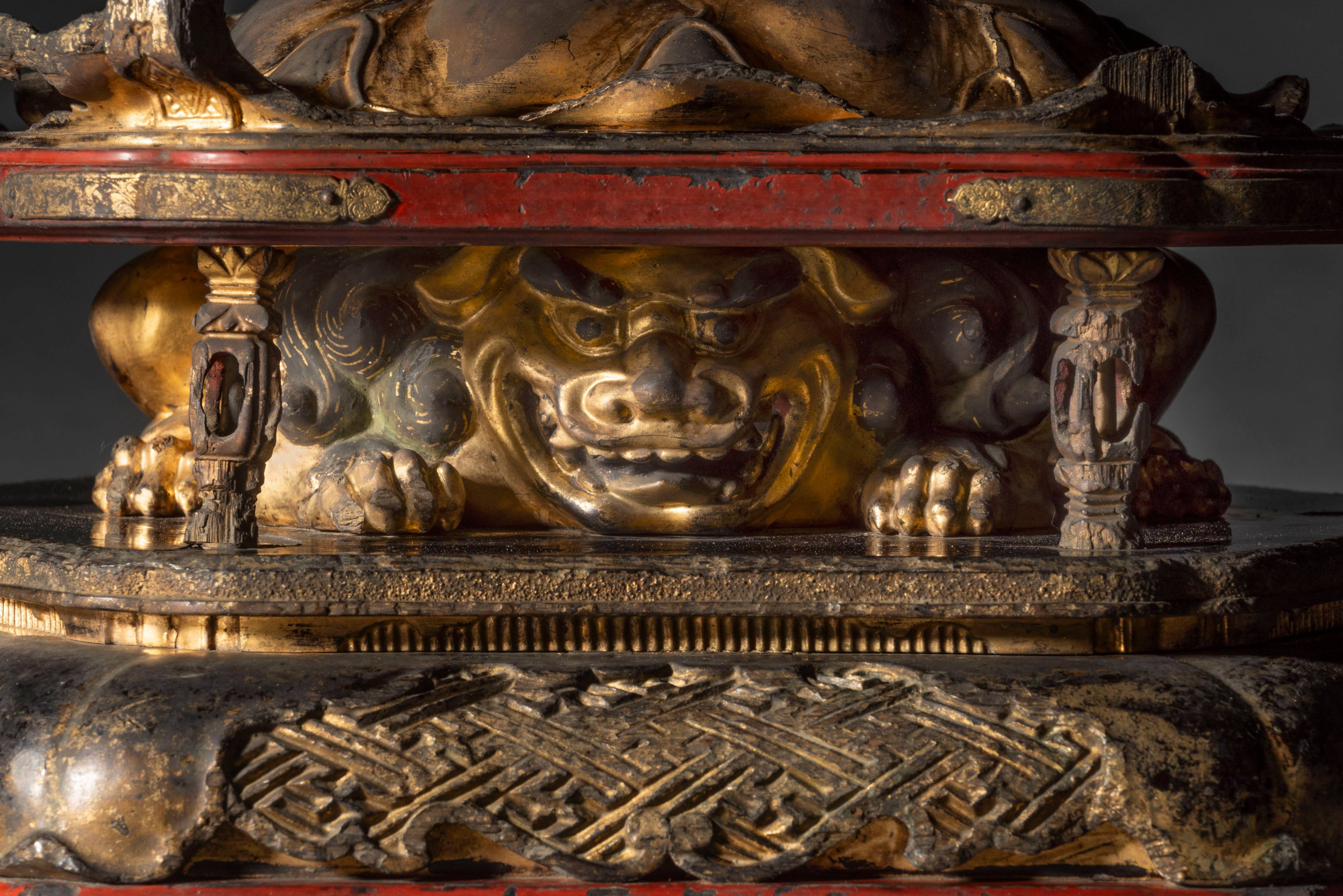 A lacquered wood zushi (travelling shrine), containing a figure of Jizō Bosatsu seated on a double-lotus base before a mandorla with three Nyo-i Hōju (wish granting jewels). Jizō holds a shakujō (Buddhist staff) in the right hand and a Nyo-i Hōju in the left. The robes and base are delicately decorated in kirikane (thin cut strips of gold). The zushi has gilt metal mounts and the interior is gilded, the doors painted with a design of lotus flowers