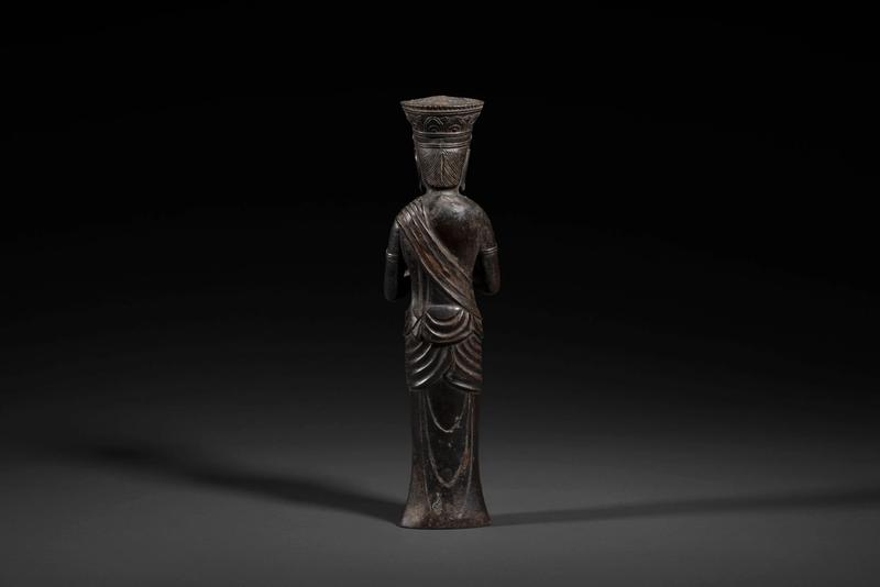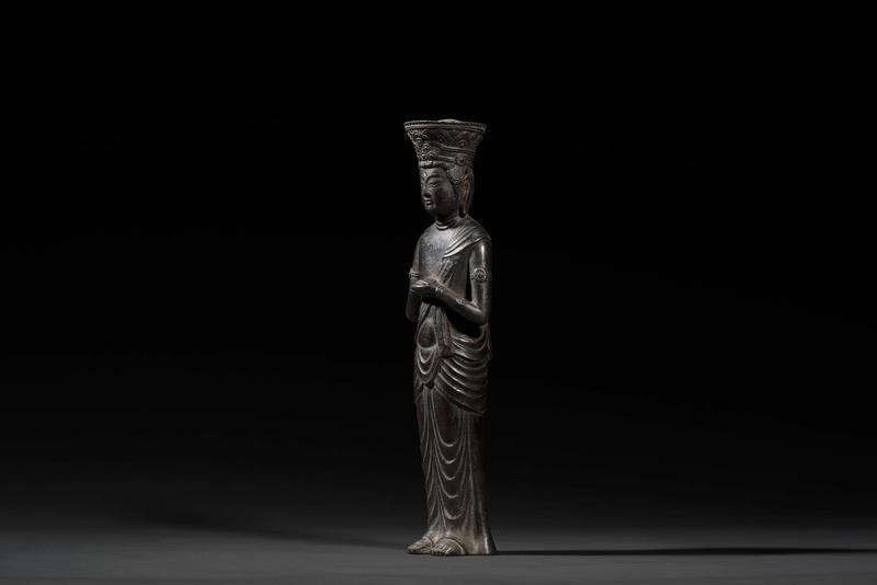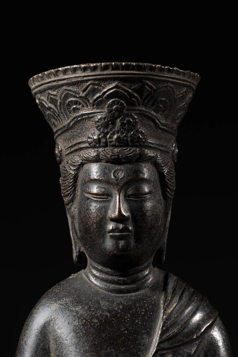 Veneration of Kannon began in Japan in the late 6th century, soon after Buddhism had been introduced by way of China and Korea. In both painting and sculpture Kannon’s crown is often adorned with a small image of Amida (a kebutsu) as in this figure, symbolising Kannon’s role as Amida’s principal attendant. Kannon is one of the most popular modern deities in Japan’s Pure Land sects and serves various functions including protecting the Six Realms of Karmic Rebirth, acting as patron of motherhood and children, and protecting the souls of infants lost during childbirth.