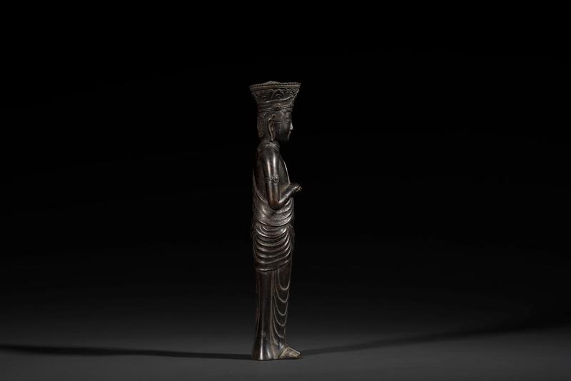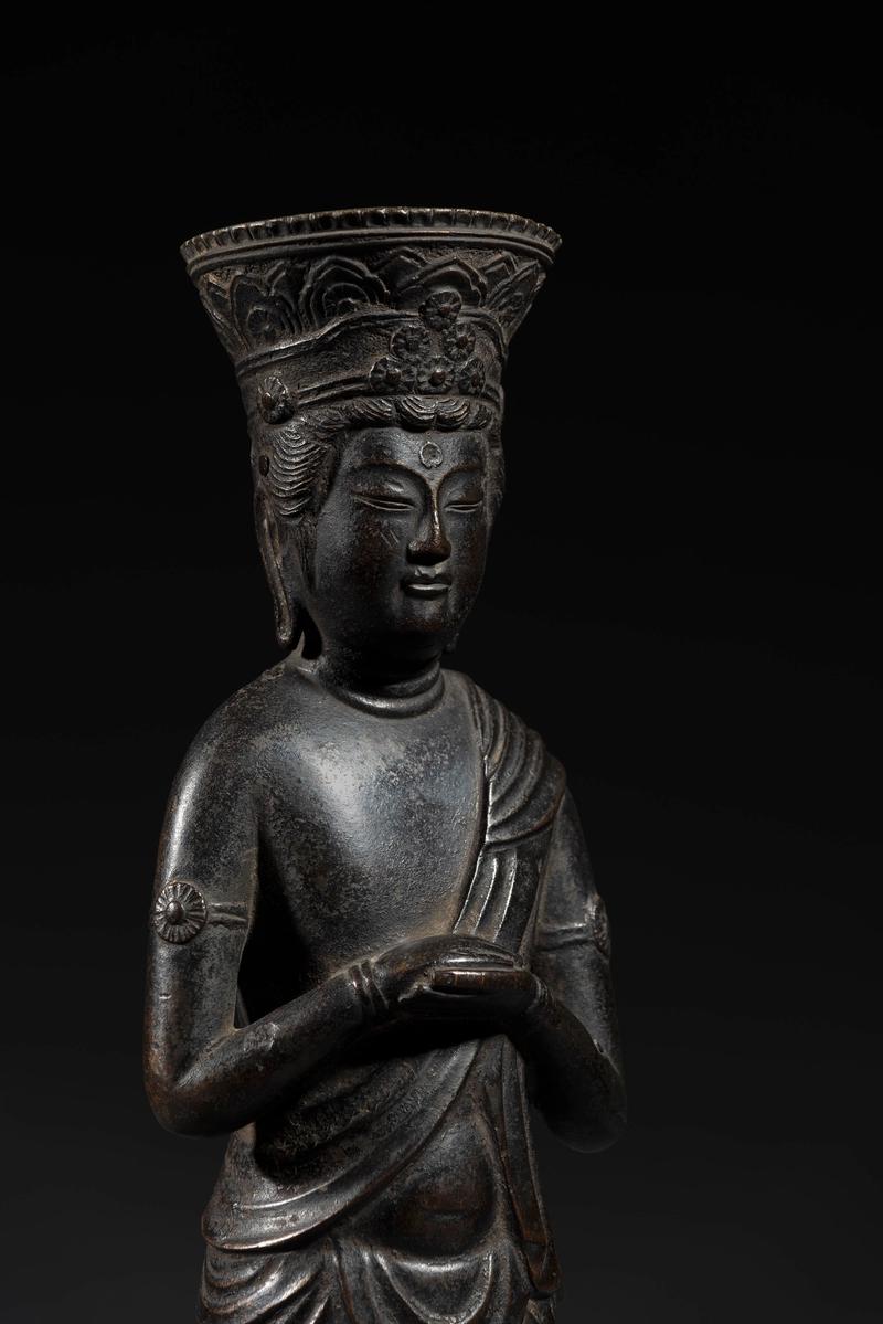 A gilt bronze figure of Kannon Bosatsu (Bodhisattva) in the Zenkoji-style with the hands clasped in front of the chest and the head adorned with a crown decorated with flowers