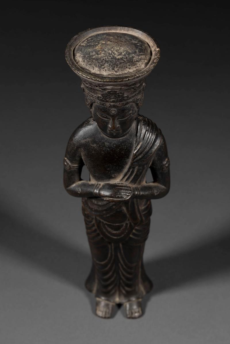 The original triad has always been treasured and was designated as hibutsu (hidden Buddhas or secret Buddhas) and withheld from public view from the year 654 A.D. The practice of concealing important Buddhist icons is a concept unique to Japan and is thought to date back to at least the 7th century. Some hibutsu are put on public display for specific short periods, but some are never unveiled, this practice is known as zettai hibutsu (“absolute” hidden Buddhas) and the Zenkoji triad is one of them. In the Kamakura period, a replica of this original triad was made as an alternative devotional image however this version is also hibutsu and is only unveiled once every seven years for viewing at the same temple. The original triad of Zenkoji temple is allegedly the oldest Buddhist image in Japan and was a gift to the Japanese Emperor Kinmei (509-571) from Seong (d. 554), the 26th king of Baekje, one of the Three Kingdoms of Korea. During the Kamakura and Muromachi periods momentum for returning to the origin of Buddhism was at its peak and numerous Zenkoji-style Amida triads were produced in bronze, most of them coming from the Kanto area near modern day Tokyo.