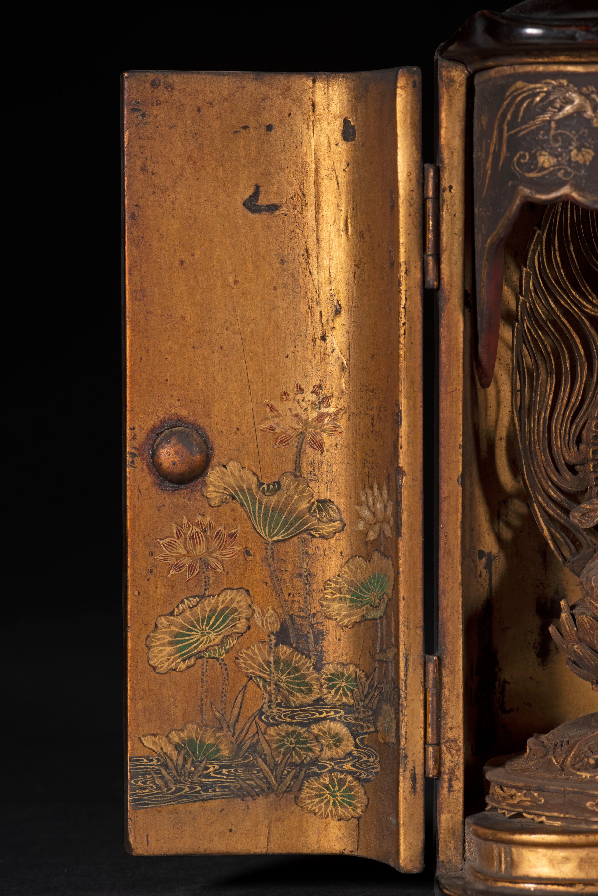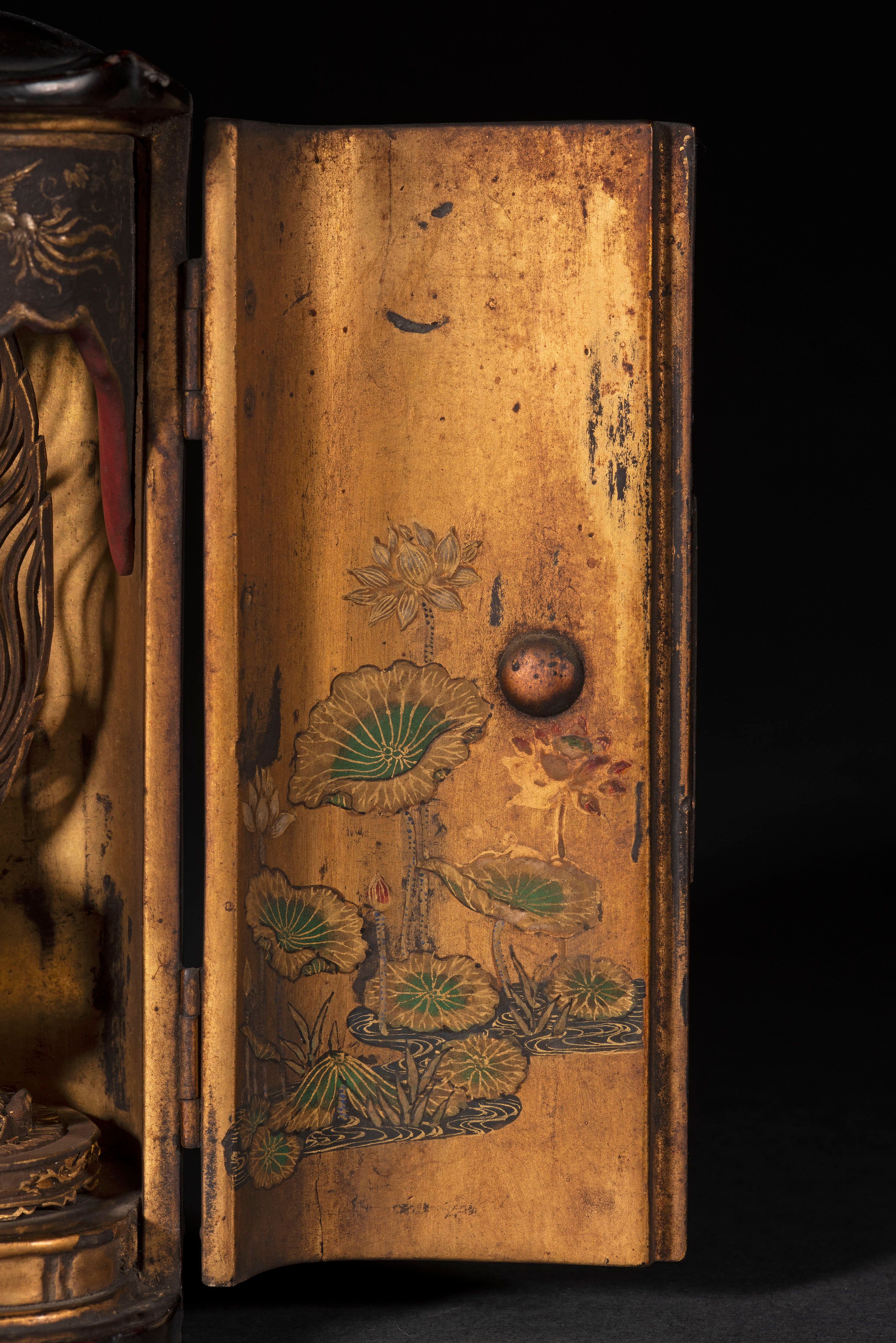 The black-lacquered shrine has gilt metal mounts; its interior is gilded and painted with lotus flowers in water.