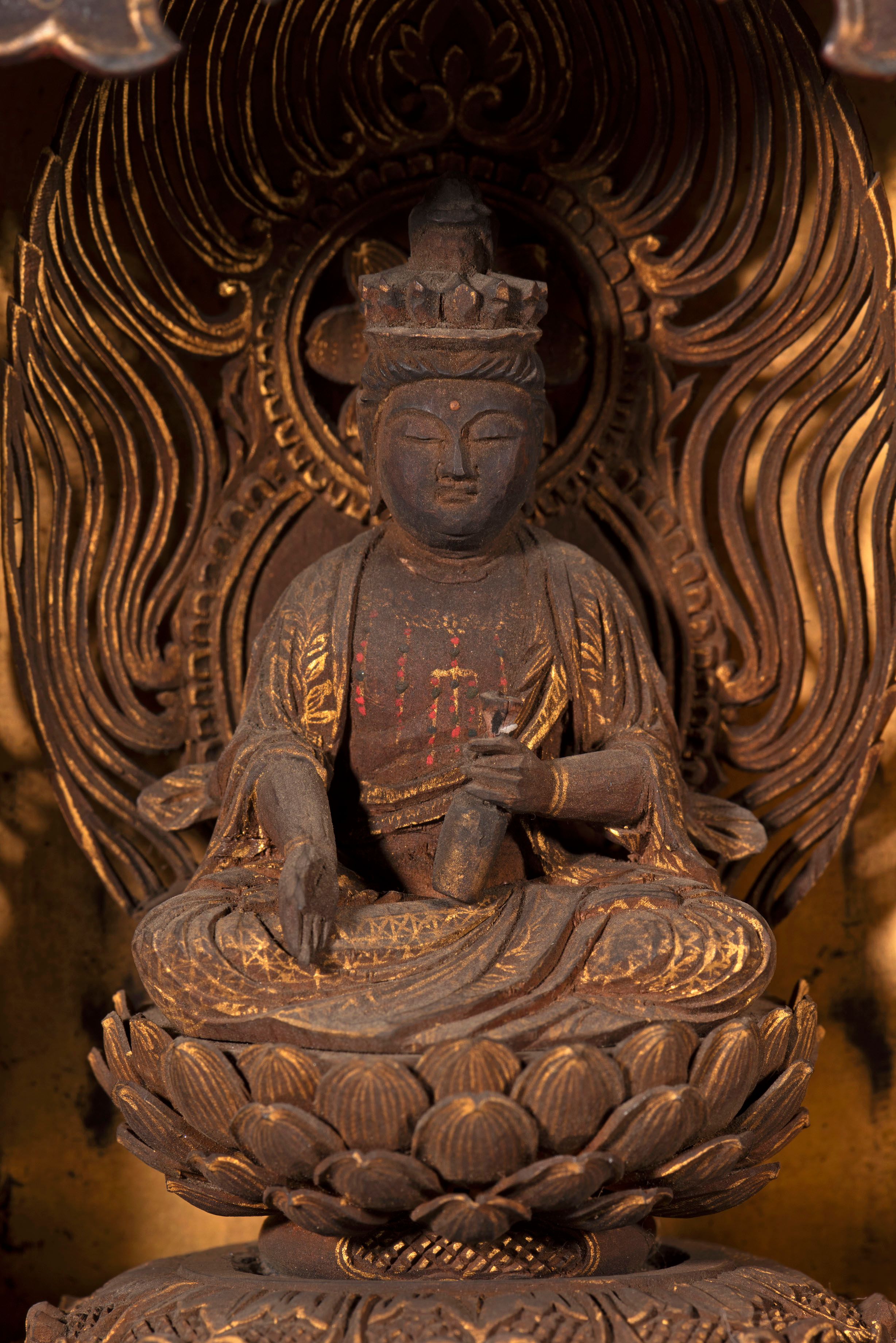 The left hand holds a byo (vase) and the right hand is in the yogan-in (the granting of wishes) mudra; the chest is bejewelled with a munakazari (pectoral ornament); the flowing robes are decorated in gold with vine and geometric designs.