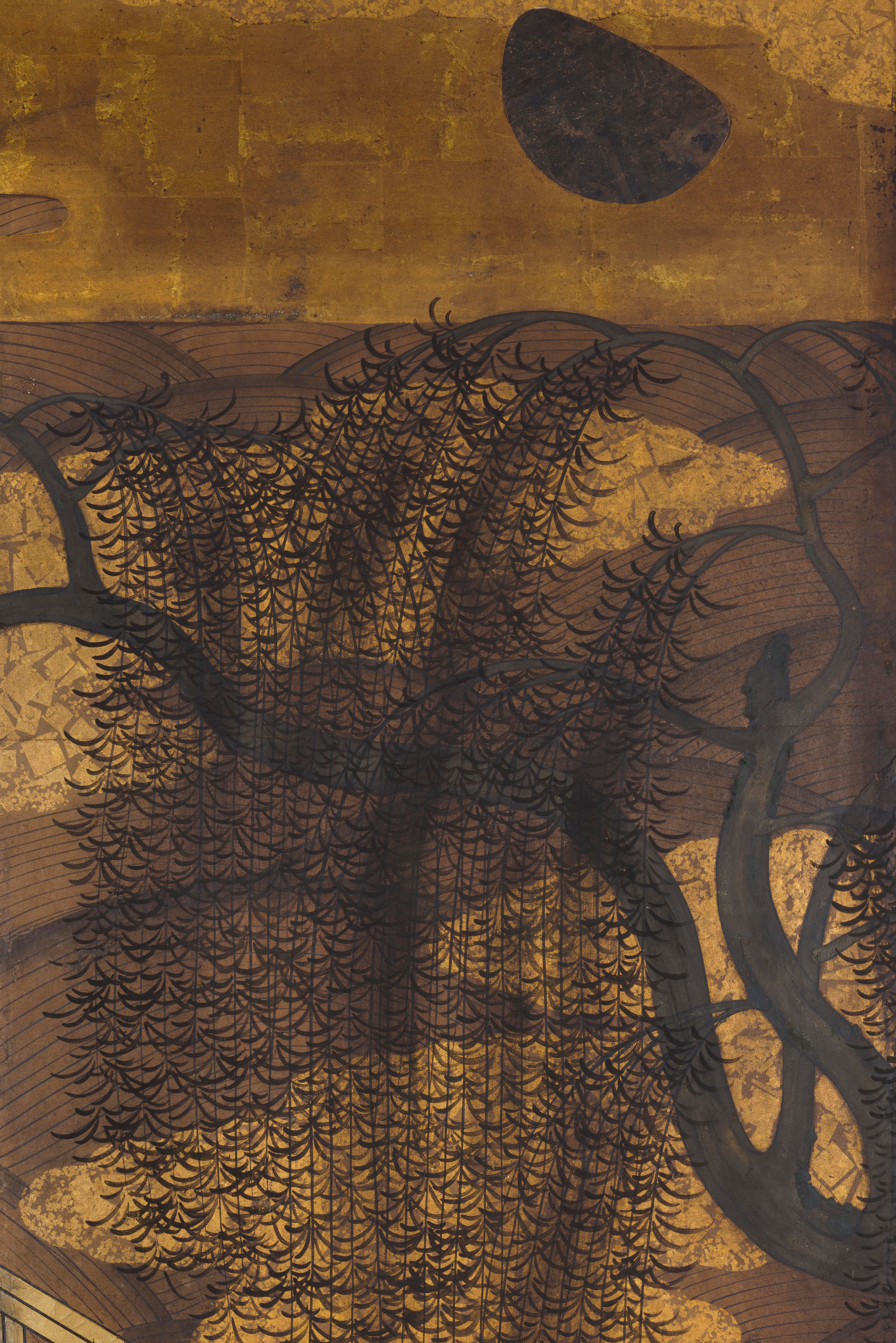 This screen with its depiction of the famous Bridge at Uji is from a genre of Yamatoe-e (Japanese painting) known as meisho-e (paintings of famous places). It is executed with a luxurious combination of gold leaf (both solid and scattered irregularly) and gold paint of contrasting hues and reflectivity. The Uji river tosses up delicate arabesques among its swells as it rushes across the six panels. Reading from right to left one is drawn into this other worldly vision by the expansive golden bridge. Graceful willow trees mark the passing seasons and a waxing moon in silver leaf hangs amongst the clouds in the distance.
