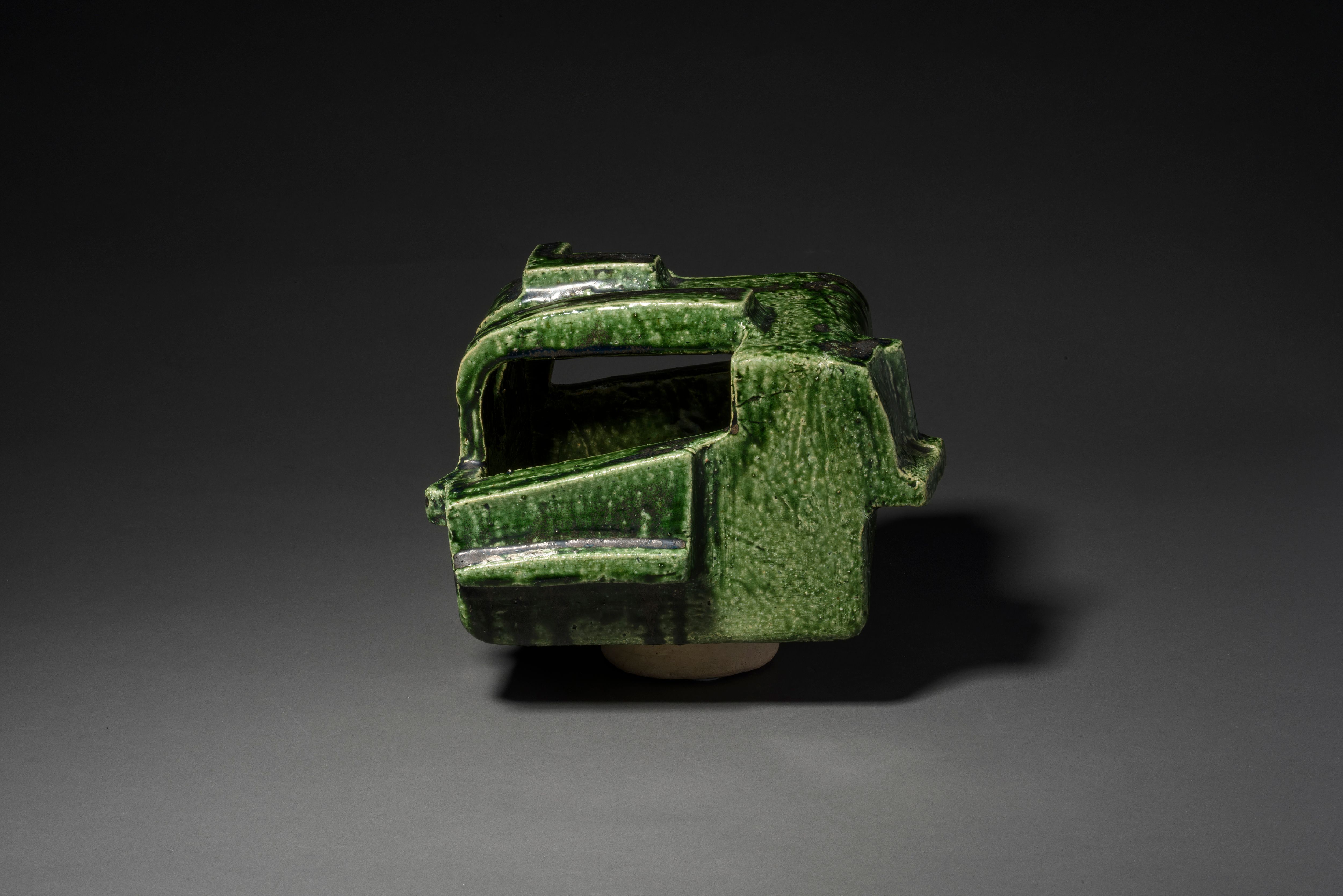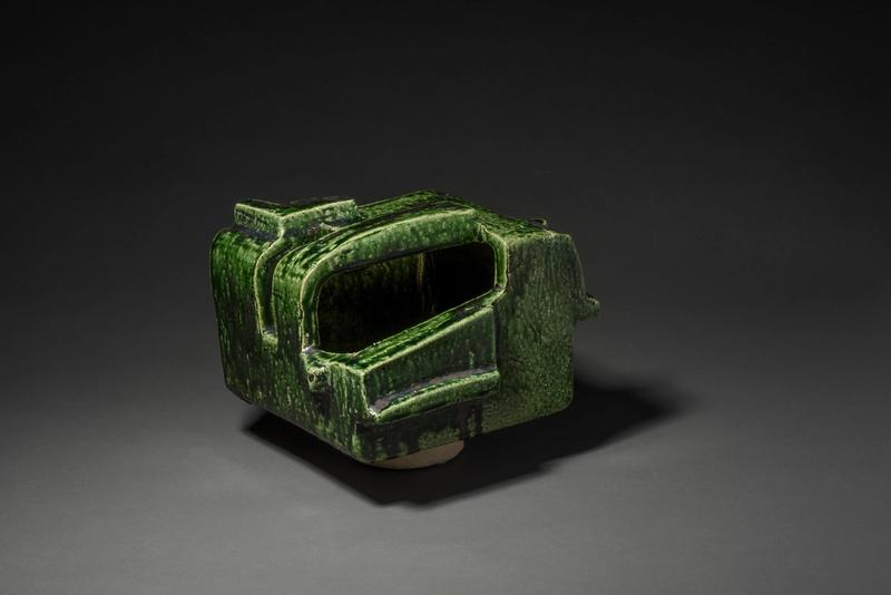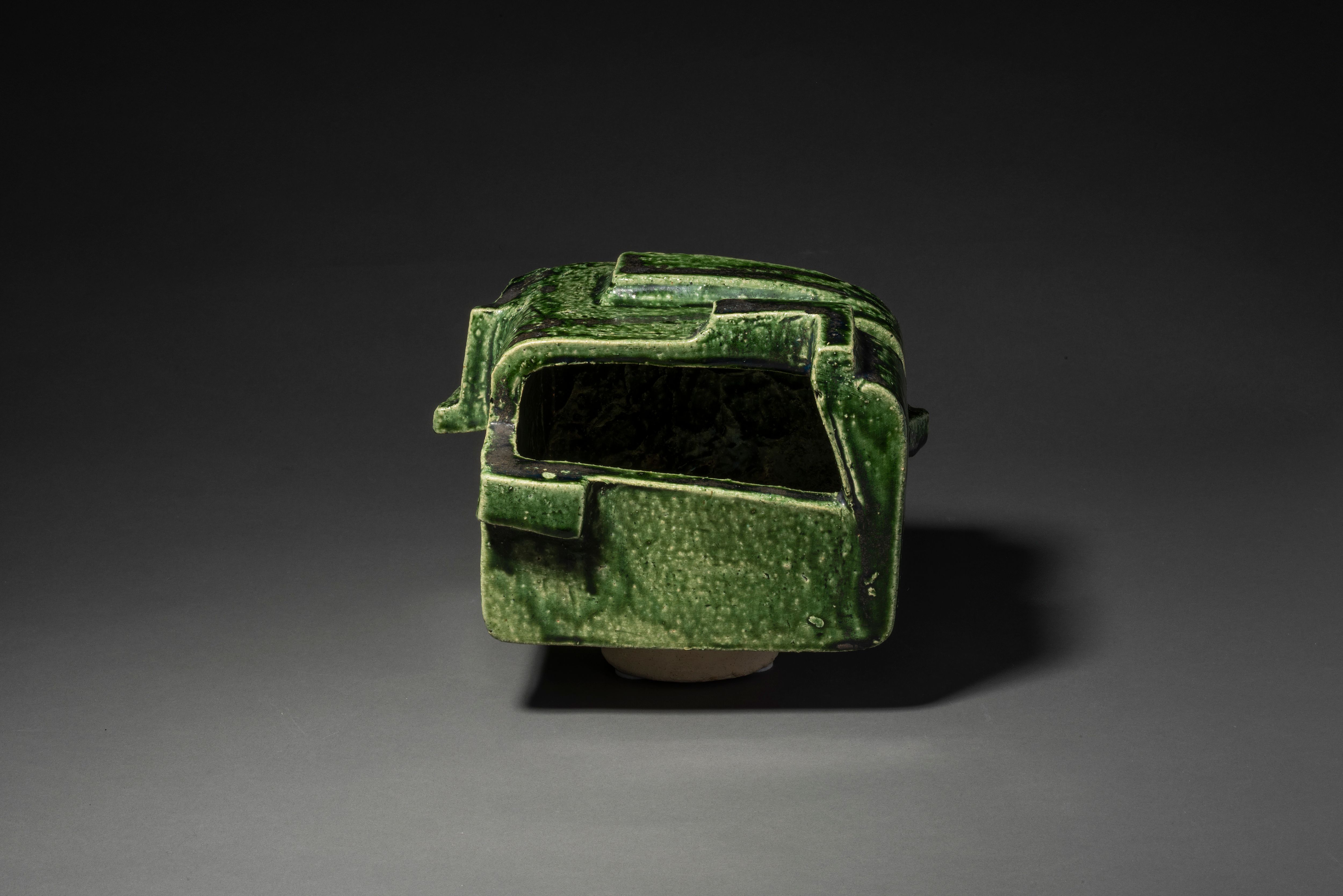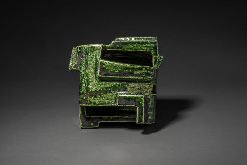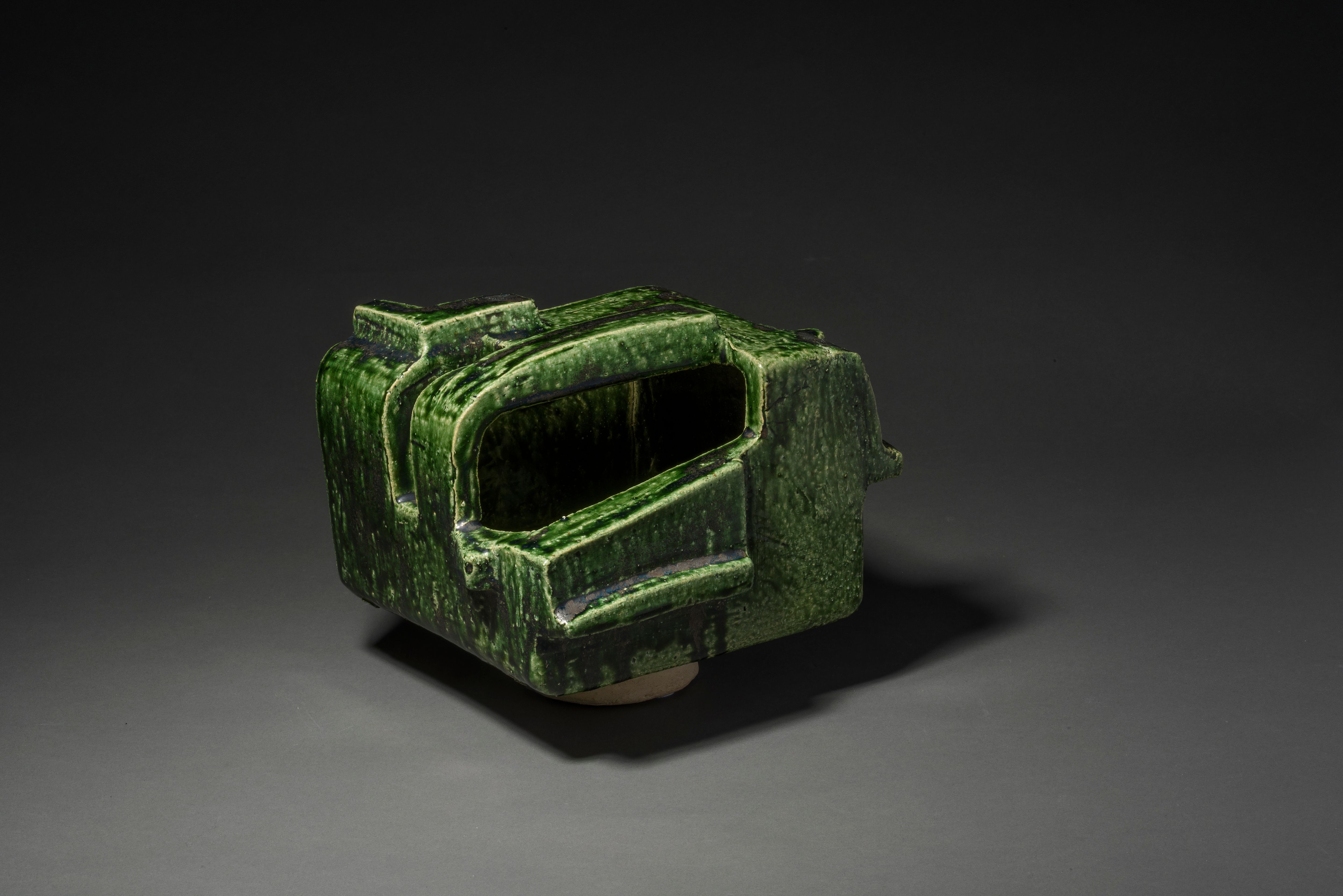 A ceramic vessel of abstract design, decorated in a deep green Oribe glaze