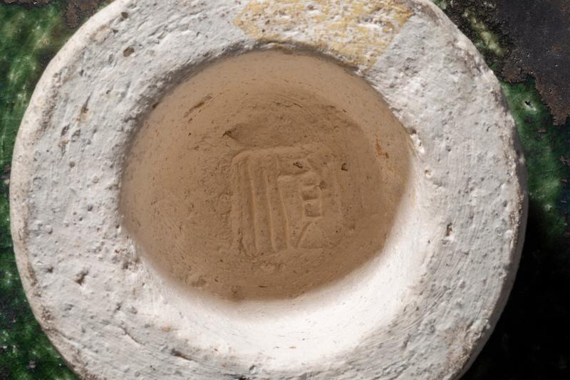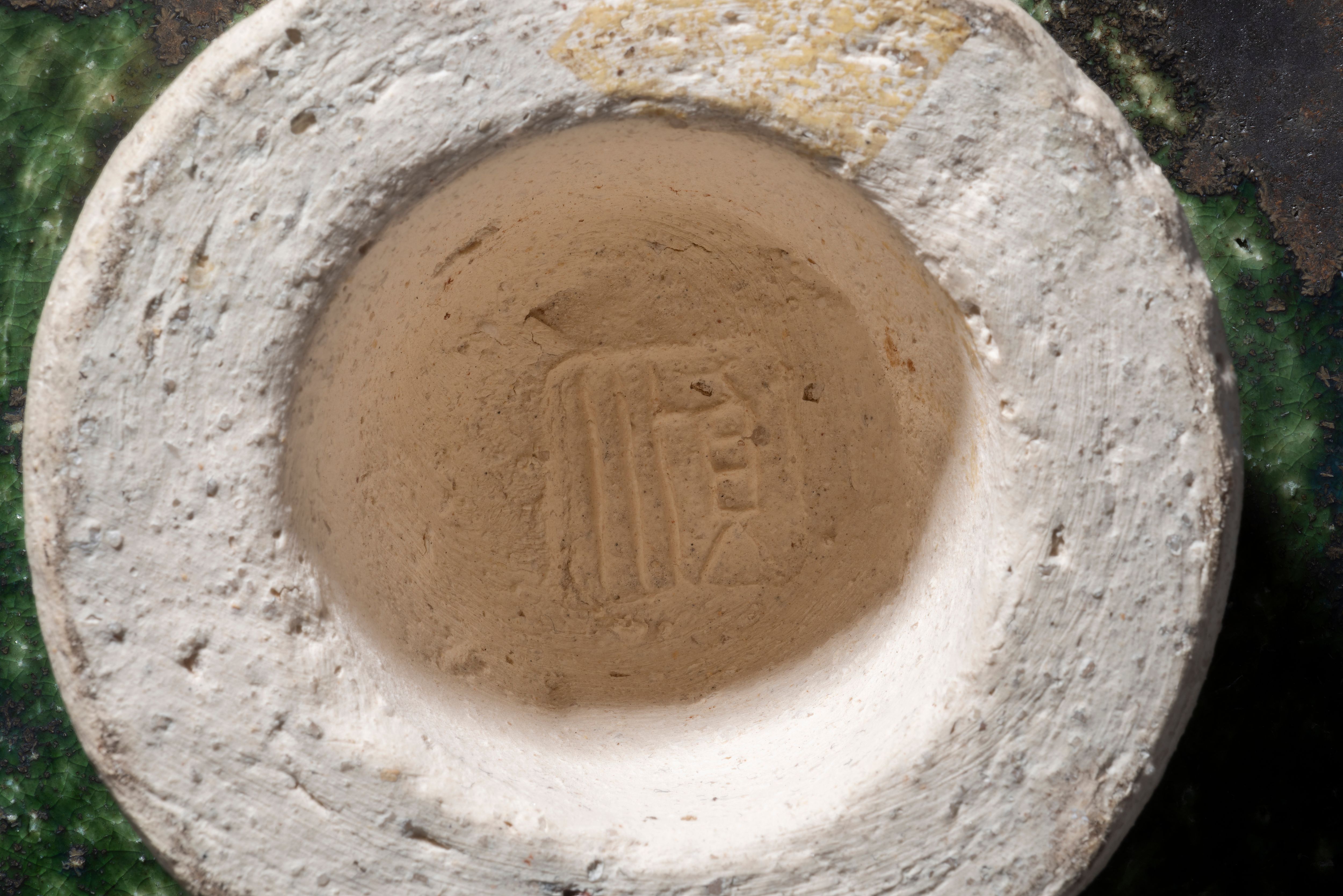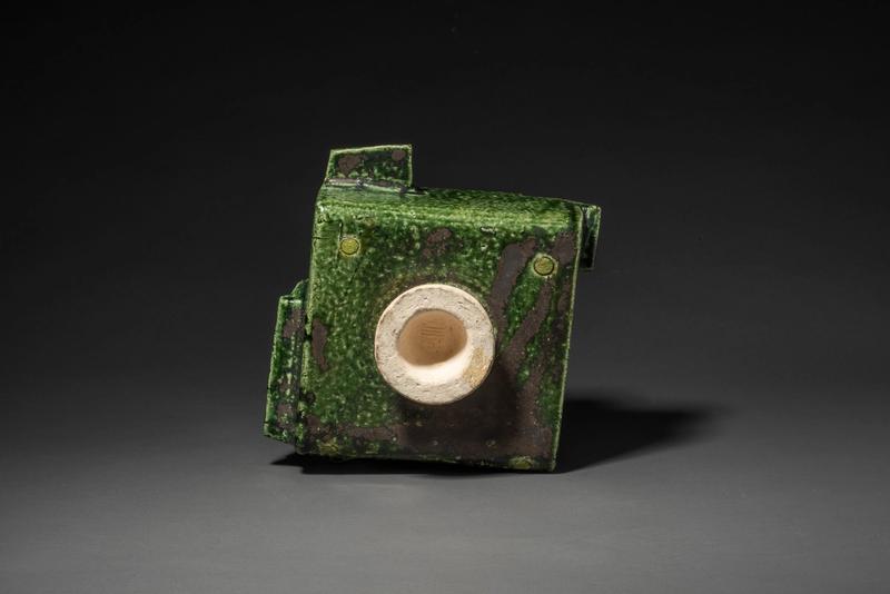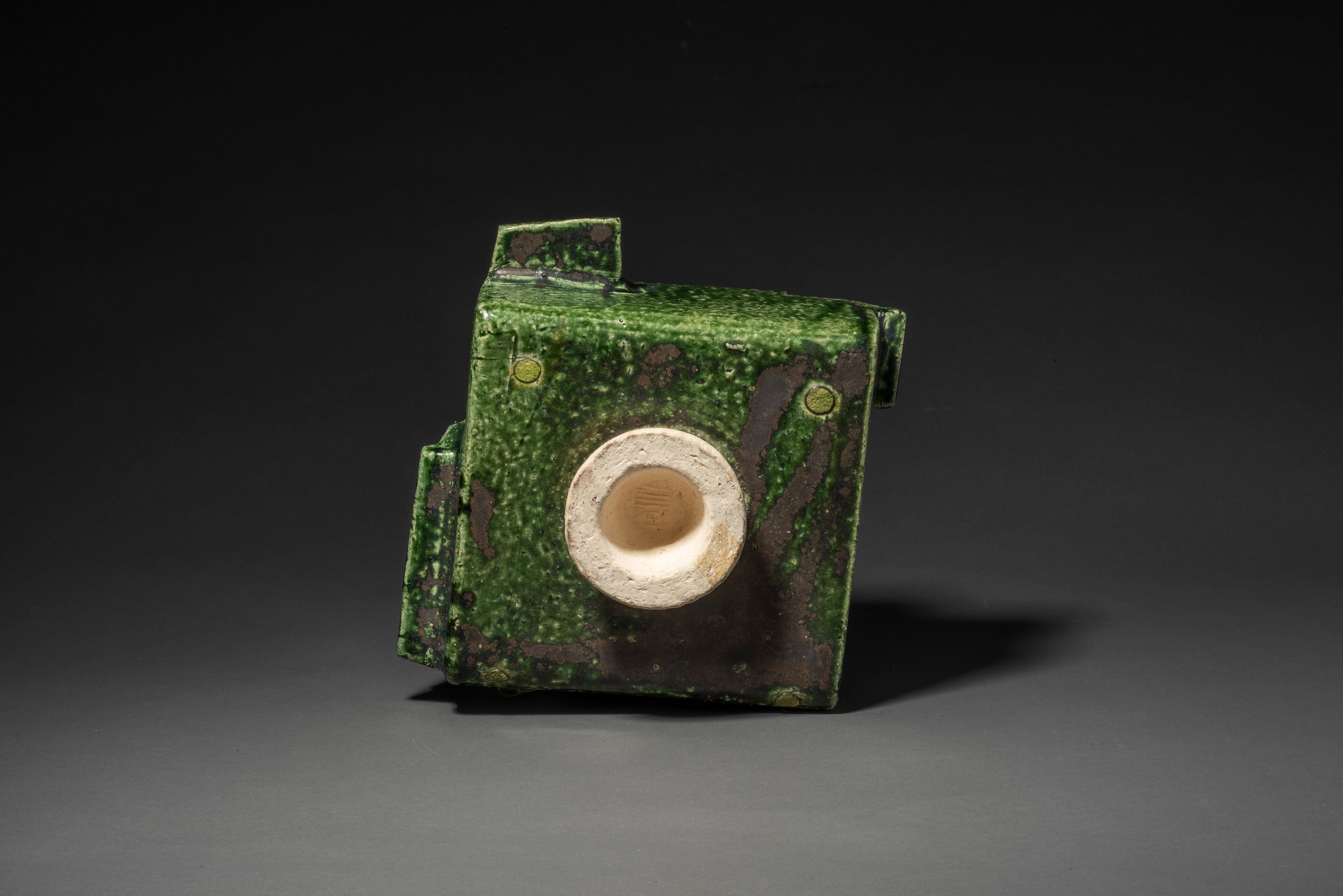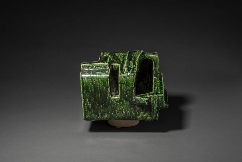 A ceramic vessel of abstract design, decorated in a deep green Oribe glaze